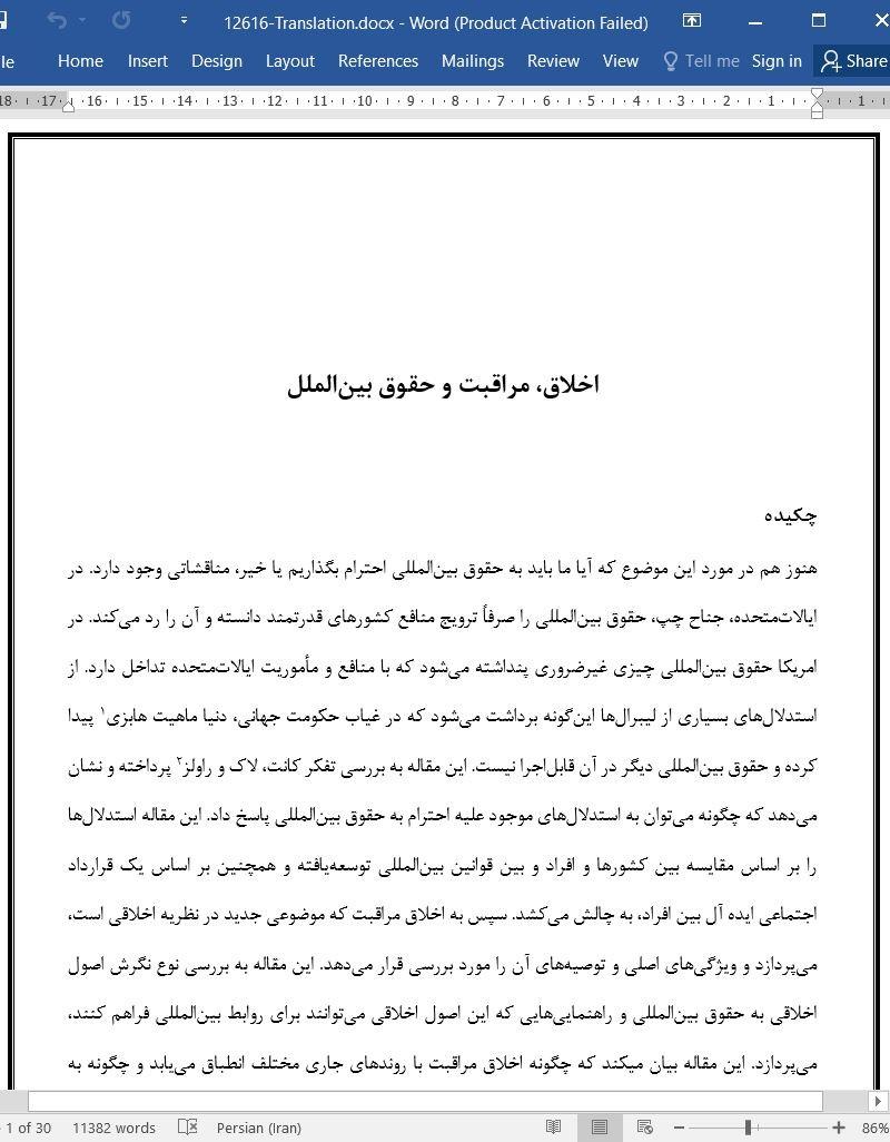 هنوز هم در مورد این موضوع که آیا ما باید به حقوق بینالمللی احترام بگذاریم یا خیر، مناقشاتی وجود دارد. در ایالاتمتحده، جناح چپ، حقوق بینالمللی را صرفاً ترویج منافع کشورهای قدرتمند دانسته و آن را رد می-کند. در امریکا حقوق بینالمللی چیزی غیر¬ضروری پنداشته می¬شود که با منافع و مأموریت ایالاتمتحده تداخل دارد. از استدلال های بسیاری از لیبرالها اینگونه برداشت می شود که در غیاب حکومت جهانی، دنیا ماهیت هابزی پیدا کرده و حقوق بینالمللی دیگر در آن قابل اجرا نیست. این مقاله به بررسی تفکر کانت، لاک و راولز پرداخته و نشان می¬دهد که چگونه می¬توان به استدلال¬های موجود علیه احترام به حقوق بین المللی پاسخ داد. این مقاله استدلال ها را بر اساس مقایسه بین کشورها و افراد و بین قوانین بینالمللی توسعه¬یافته و همچنین بر اساس یک قرارداد اجتماعی ایده آل بین افراد، به چالش می کشد. سپس به اخلاق مراقبت که موضوعی جدید در نظریه اخلاقی است، می پردازد و ویژگی های اصلی و توصیه های آن را مورد بررسی قرار می دهد. این مقاله به بررسی نوع نگرش اصول اخلاقی به حقوق بینالمللی و راهنمایی هایی که این اصول اخلاقی می توانند برای روابط بینالمللی فراهم کنند، می پردازد. این مقاله بیان میکند که چگونه اخلاق مراقبت با روندهای جاری مختلف انطباق می یابد و چگونه به تفکر جهانی سازی و وابستگی بینالمللی بیشتر، توجه بیشتری می شود. این مقاله استدلال می کند که اخلاق مراقبت بهوضوح از احترام به حقوق بینالمللی حمایت می کند اما این پشتیبانی آنچنان به مشکلات فعلی می پردازد که در دراز مدت موجب درخواست تجدیدنظر در قانون و اجرای آن می گردد که تا به حال کمتر چنین موردی پیش آمده است.