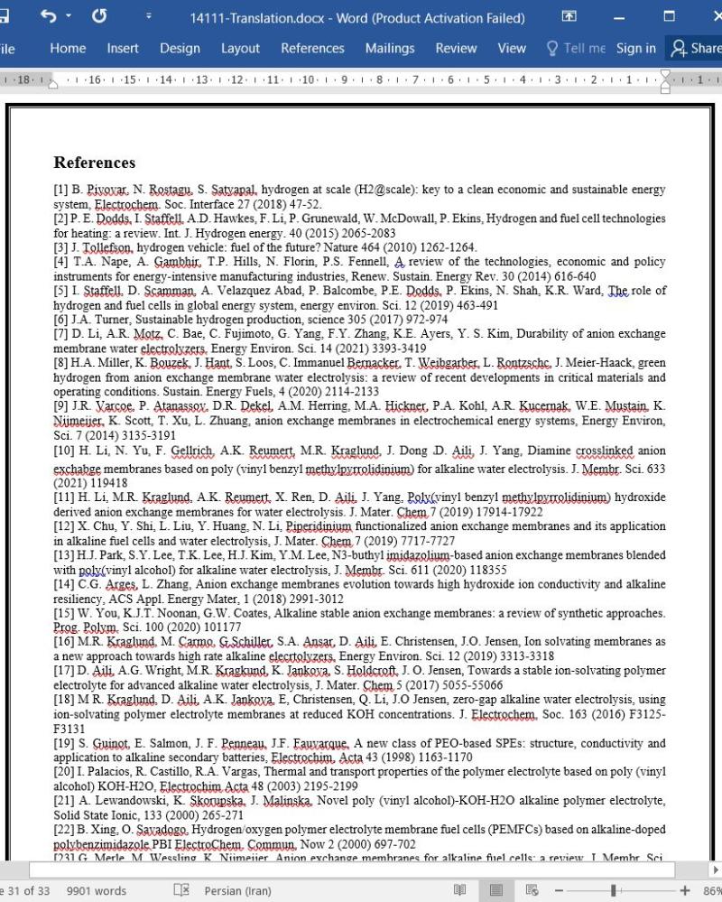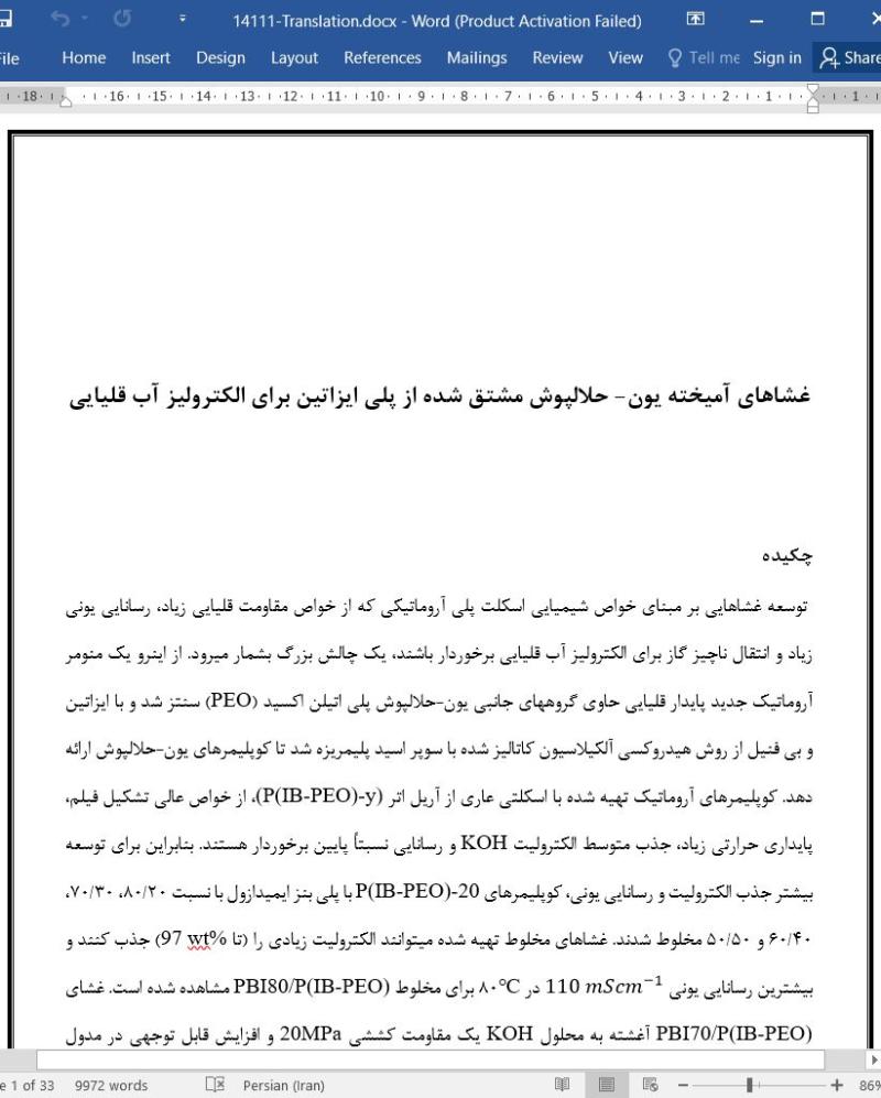 توسعه غشاهایی بر مبنای خواص شیمیایی اسکلت پلی آروماتیکی که از خواص مقاومت قلیایی زیاد، رسانایی یونی زیاد و انتقال ناچیز گاز برای الکترولیز آب قلیایی برخوردار باشند، یک چالش بزرگ بشمار میرود. از اینرو یک منومر آروماتیک جدید پایدار قلیایی حاوی گروههای جانبی یون-حلالپوش پلی اتیلن اکسید (PEO) سنتز شد و با ایزاتین و بی فنیل از روش هیدروکسی آلکیلاسیون کاتالیز شده با سوپر اسید پلیمریزه شد تا کوپلیمرهای یون-حلالپوش ارائه دهد. کوپلیمرهای آروماتیک تهیه شده با اسکلتی عاری از آریل اتر (P(IB-PEO)-y)، از خواص عالی تشکیل فیلم، پایداری حرارتی زیاد، جذب متوسط الکترولیت KOH و رسانایی نسبتاً پایین برخوردار هستند. بنابراین برای توسعه بیشتر جذب الکترولیت و رسانایی یونی، کوپلیمرهای P(IB-PEO)-20 با پلی بنز ایمیدازول با نسبت 20/80، 30/70، 40/60 و 50/50 مخلوط شدند. غشاهای مخلوط تهیه شده میتوانند الکترولیت زیادی را (تا 97 wt%) جذب کنند و بیشترین رسانایی یونی 110 mScm^(-1) در ℃80 برای مخلوط PBI80/P(IB-PEO) مشاهده شده است. غشای PBI70/P(IB-PEO) آغشته به محلول KOH یک مقاومت کششی 20MPa و افزایش قابل توجهی در مدول یانگ (131%) در مقایسه با غشای PBI80/P(IB-PEO) نشان میدهد. تست پایداری قلیایی شرح داده است که غشای PBI80/P(IB-PEO) اساساً مدول یانگ بزرگتری (افزایش 144%) پس از یک ماه در محلول KOH 20wt% در ℃80 نسبت به همتای عمل نیامده خود نشان میدهد. همچنین غشاهای PBI80/P(IB-PEO) و PBI70/P(IB-PEO) حدود 98-96 درصد از رسانایی ذاتی خود را پس از عمل آوری حفظ میکنند که نشاندهندۀ مقاومت قلیایی عالی آنهاست. غشاهای منتخب در یک الکترولایزر سلول واحد برای ارزیابی امکانسنجی و رفتار انتقال گاز مورد آزمایش قرار گرفتند.