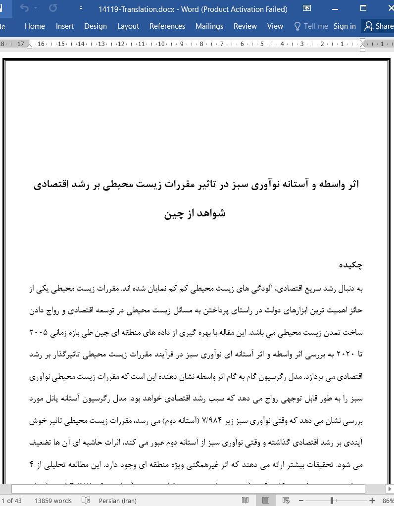 به دنبال رشد سریع اقتصادی، آلودگی های زیست محیطی کم کم نمایان شده اند. مقررات زیست محیطی یکی از حائز اهمیت ترین ابزارهای دولت در راستای پرداختن به مسائل زیست محیطی در توسعه اقتصادی و رواج دادن ساخت تمدن زیست محیطی می باشد. این مقاله با بهره گیری از داده های منطقه ای چین طی بازه زمانی 2005 تا 2020 به بررسی اثر واسطه و اثر آستانه ای نوآوری سبز در فرآیند مقررات زیست محیطی تاثیرگذار بر رشد اقتصادی می پردازد. مدل رگرسیون گام به گام اثر واسطه نشان دهنده این است که مقررات زیست محیطی نوآوری سبز را به طور قابل توجهی رواج می دهد که سبب رشد اقتصادی خواهد بود. مدل رگرسیون آستانه پانل مورد بررسی نشان می دهد که وقتی نوآوری سبز زیر 984/7 (آستانه دوم) می رسد، مقررات زیست محیطی تاثیر خوش آیندی بر رشد اقتصادی گذاشته و وقتی نوآوری سبز از آستانه دوم عبور می کند، اثرات حاشیه ای آن ها تضعیف می شود. تحقیقات بیشتر ارائه می دهند که اثر غیرهمگنی ویژه منطقه ای وجود دارد. این مطالعه تحلیلی از 4 منطقه چین می باشد. هنگامی که نوآوری سبز از حد معینی فراتر میرود (آستانه شرقی 4٫382 است، آستانه مرکزی 6٫553، آستانه غربی 5٫037، آستانه شمال شرقی 5٫347 است)، اثر حاشیه ای هر منطقه را کاهش میدهد. نتایج این پژوهش می تواند بعنوان مرجعی برای دولت باشد که سیاست های عاقلانه ای را به جهت برپایی توازن اقتصادی و زیست محیطی تدوین نماید.