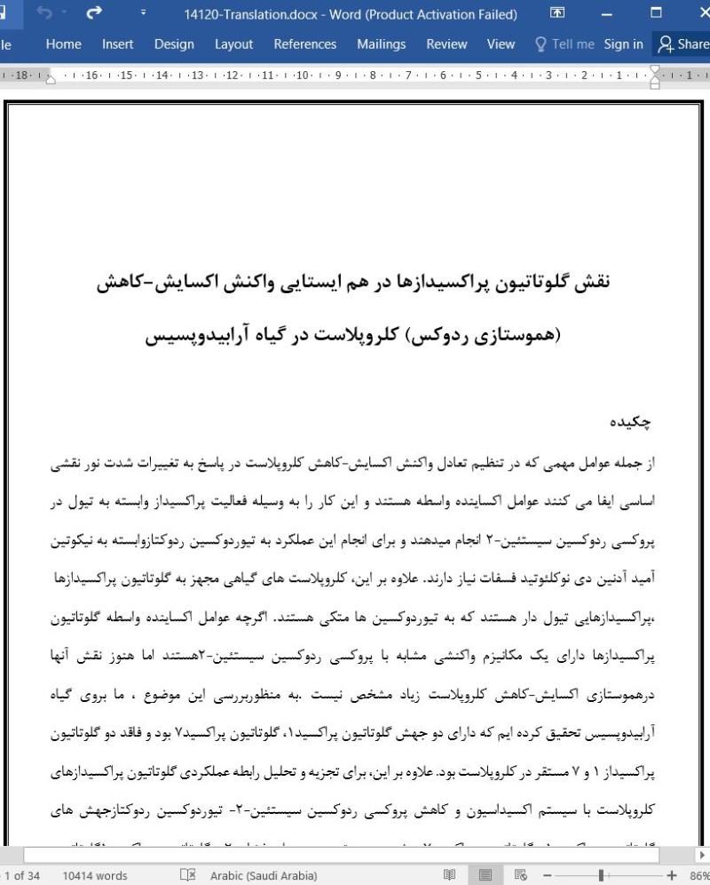 از جمله عوامل مهمی که در تنظیم تعادل واکنش اکسایش-کاهش کلروپلاست در پاسخ به تغییرات شدت نور نقشی اساسی ایفا می کنند عوامل اکساینده واسطه هستند و این کار را به وسیله فعالیت پراکسیداز وابسته به تیول در پروکسی ردوکسین سیستئین-2 انجام میدهند و برای انجام این عملکرد به تیوردوکسین ردوکتازوابسته به نیکوتین آمید آدنین دی نوکلئوتید فسفات نیاز دارند. علاوه بر این، کلروپلاست های گیاهی مجهز به گلوتاتیون پراکسیدازها ،پراکسیدازهایی تیول دار هستند که به تیوردوکسین ها متکی هستند .اگرچه عوامل اکساینده واسطه گلوتاتیون پراکسیدازها دارای یک مکانیزم واکنشی مشابه با پروکسی ردوکسین سیستئین-2هستند اما هنوز نقش آنها درهموستازی اکسایش-کاهش کلروپلاست زیاد مشخص نیست .به منظوربررسی این موضوع ، ما بروی گیاه آرابیدوپسیس تحقیق کرده ایم که دارای دو جهش گلوتاتیون پراکسید1، گلوتاتیون پراکسید7 بود و فاقد دو گلوتاتیون پراکسیداز 1 و 7 مستقر در کلروپلاست بود. علاوه بر این، برای تجزیه و تحلیل رابطه عملکردی گلوتاتیون پراکسیدازهای کلروپلاست با سیستم اکسیداسیون و کاهش پروکسی ردوکسین سیستئین-2- تیوردوکسین ردوکتازجهش های گلوتاتیون پراکسید1، گلوتاتیون پراکسید7- شپرون پروتئینی متصل غشایی2و گلوتاتیون پراکسید1گلوتاتیون پراکسید7-تیوردوکسین ردوکتازایجاد شدند.جهش گلوتاتیون پراکسید1،گلوتاتیون پراکسید7 فنوتیپ نوع وحشی را نشان می دهد که اثبات کننده این است که گلوتاتیون پراکسیدازهای کلروپلاست برای حداقل رشد گیاه تحت شرایط استاندارد ضروری هستن .با این حال،جهش- گلوتاتیون پراکسید1 گلوتاتیون پراکسید7- شپرون پروتئینی متصل غشایی2رشد کندتری نسبت به جهش شپرون پروتئینی متصل غشایی2 نشان داد .فقدان همزمان پروکسی ردوکسین سیستئین-2و گلوتاتیون پراکسیداز بر عملکرد محتوای کلروفیل و عملکرد فتوسیستم2تأثیر گذاشت و باعث تاخیر بیشتر در اکسیداسیون آنزیم در تاریکی شد.در مقابل جهش-گلوتاتیون پراکسید-1گلوتاتیون پراکسید7-تیوردوکسین ردوکتاز، با ترکیب کردن فقدان تیوردوکسین ردوکتازو گلوتاتیون پراکسیدازهای کلروپلاست مانند جهش تیوردوکسین ردوکتاز رفتار می کنند که نشان می دهد سهم گلوتاتیون پراکسیدازهادر هم ایستایی واکنش اکسایش-کاهش کلروپلاست مستقل از تیوردوکسین ردوکتازاست.سنجش های آزمایشگاهی به بررسی بیشتر این نظریه پرداختند و نشان دادند که فرایند کاهش توسط تیوردوکسین ردوکتاز اتفاق نمی افتد، بلکه کاهش به وسیله تیوردوکسین y2 رخ میدهد.بر اساس این نتایج، ما نقشی را برای گلوتاتیون پراکسیدازها در توالی اکسایش-کاهش کلروپلاست ارائه دادیم .