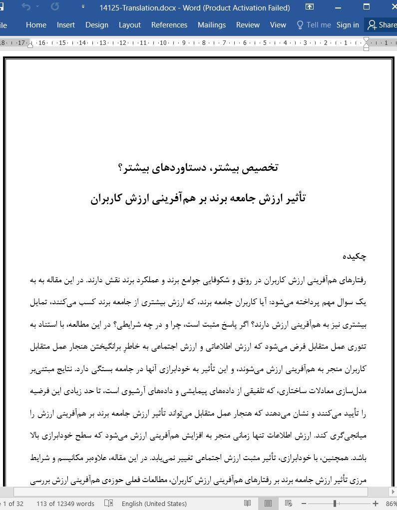 رفتارهای همآفرینی ارزش کاربران در رونق و شکوفایی جوامع برند و عملکرد برند نقش دارند. در این مقاله به به یک سوال مهم پرداخته میشود: آیا کاربران جامعه برند، که ارزش بیشتری از جامعه برند کسب میکنند، تمایل بیشتری نیز به همآفرینی ارزش دارند؟ اگر پاسخ مثبت است، چرا و در چه شرایطی؟ در این مطالعه، با استناد به تئوری عمل متقابل فرض میشود که ارزش اطلاعاتی و ارزش اجتماعی به خاطرِ برانگیختن هنجار عمل متقابل کاربران منجر به همآفرینی ارزش میشوند، و این تأثیر به خودابرازی آنها در جامعه بستگی دارد. نتایج مبتنیبر مدلسازی معادلات ساختاری، که تلفیقی از دادههای پیمایشی و دادههای آرشیوی است، تا حد زیادی این فرضیه را تأیید میکنند و نشان میدهند که هنجار عمل متقابل میتواند تأثیر ارزش جامعه برند بر همآفرینی ارزش را میانجیگری کند. ارزش اطلاعات تنها زمانی منجر به افزایش همآفرینی ارزش میشود که سطح خودابرازی بالا باشد. همچنین، با خودابرازی، تأثیر مثبت ارزش اجتماعی تغییر نمییابد. در این مقاله، علاوهبر مکانیسم و شرایط مرزی تأثیر ارزش جامعه برند بر رفتارهای همآفرینی ارزش کاربران، مطالعات فعلی حوزهی همآفرینی ارزش بررسی شده، و ملاحظات کاربردی مهم نیز ارائه میشوند.2. مروری بر مطالعات