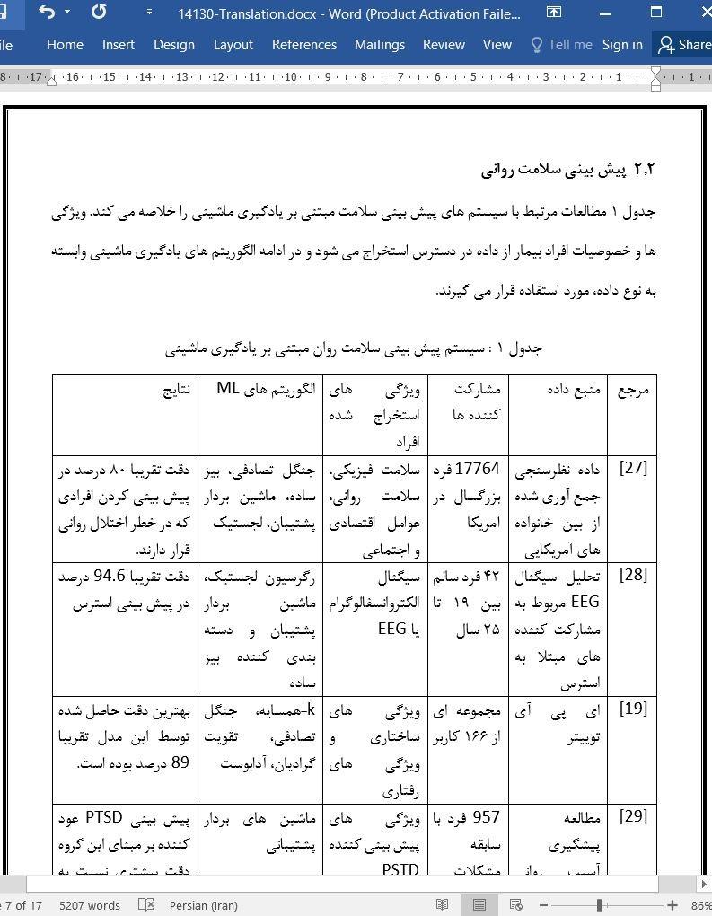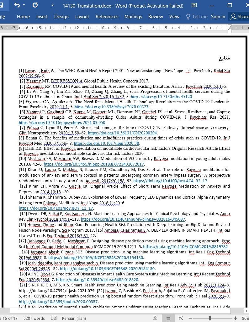 یکی از نگرانی های مهم در سرتاسر نقاط دنیا فراهم کردن مراقبت سلامت روان برای افرادی است که از اختلالات روانی رنج می برند. روان شناسی دیجیتال تاثیرات مثبتی زیادی در طول همه گیری ویروس کووید-19 به دنبال داشته است. برای مثال، روان شناسی دیجیتال میتواند افت سلامت روانی افراد و بروز مشکلات شدید مرتبط با بهداشت روانی را در مراحل اولیه پیش بینی و شناسایی کند. در نتیجه، در این مطالعه به دنبال شناسایی کردن افرادی هستیم که احتمال بروز مشکلات روانی در بین آن ها در طول دوران همه گیری بالاتر است. در راستای دست یابی به این هدف، در مطالعه خود برداشت های افراد مراقبه کننده راجا یوگا در مورد تاثیرات روانی دوران همه گیری و همچنین سطوح اضطراب، استرس و افسردگی آن ها را با دیگر افراد جامعه، مقایسه خواهیم کرد. علاوه براین، در این مطالعه با بهره گرفتن از الگوریتم های یادگیری ماشینی و داده نظرسنجی های آنلاین اجرا شده در بین افراد مراقبه کننده راجا یوگا و جمعیت عمومی تلاش میکنیم که اختلال های سلامت روان از جمله استرس، اضطراب و افسردگی را پیش بینی کنیم. در این مطالعه ما از الگوریتم های درخت تصمیم، جنگل تصادفی، بیز ساده، بردار پشتیبانی و همچنین الگوریتم k-نزدیک ترین همسایه برای پیش بینی کردن استفاده کردیم، زیرا این الگوریتم ها دقت بالاتری در پیش بینی اختلالات روانی به نمایش گذاشته اند. در بین این الگوریتم ها مشاهده کردیم که الگوریتم بردار پشتیبانی بالاترین دقت را برای داده ما تولید می کند. علاوه براین، الگوریتم بردار پشتیبانی بالاترین نمره F1 را نیز تولید کرده است.