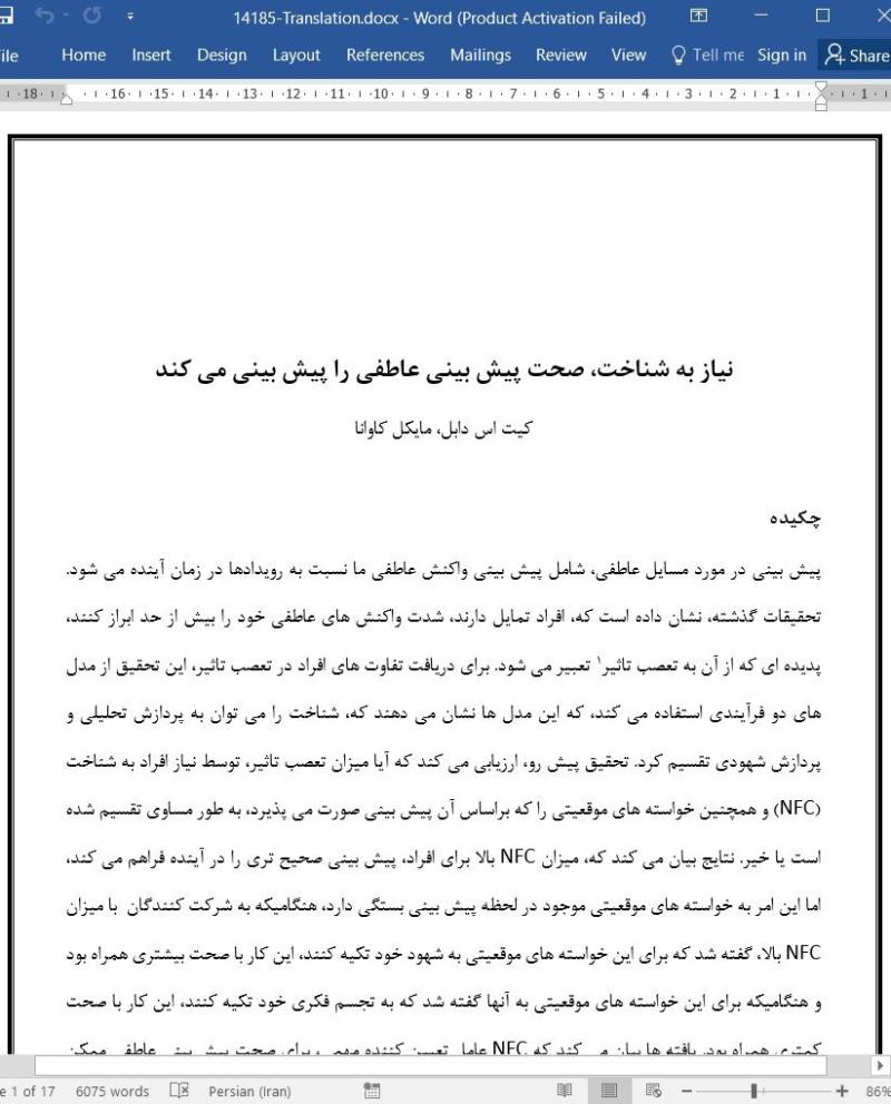 پیش بینی در مورد مسایل عاطفی، شامل پیش بینی واکنش عاطفی ما نسبت به رویدادها در زمان آینده می شود. تحقیقات گذشته، نشان داده است که، افراد تمایل دارند، شدت واکنش های عاطفی خود را بیش از حد ابراز کنند، پدیده ای که از آن به تعصب تاثیر تعبیر می شود. برای دریافت تفاوت های افراد در تعصب تاثیر، این تحقیق از مدل های دو فرآیندی استفاده می کند، که این مدل ها نشان می دهند که، شناخت را می توان به پردازش تحلیلی و پردازش شهودی تقسیم کرد. تحقیق پیش رو، ارزیابی می کند که آیا میزان تعصب تاثیر، توسط نیاز افراد به شناخت (NFC) و همچنین خواسته های موقعیتی را که براساس آن پیش بینی صورت می پذیرد، به طور مساوی تقسیم شده است یا خیر. نتایج بیان می کند که، میزان NFC بالا برای افراد، پیش بینی صحیح تری را در آینده فراهم می کند، اما این امر به خواسته های موقعیتی موجود در لحظه پیش بینی بستگی دارد، هنگامیکه به شرکت کنندگان با میزان NFC بالا، گفته شد که برای این خواسته های موقعیتی به شهود خود تکیه کنند، این کار با صحت بیشتری همراه بود و هنگامیکه برای این خواسته های موقعیتی به آنها گفته شد که به تجسم فکری خود تکیه کنند، این کار با صحت کمتری همراه بود. یافته ها بیان می کند که NFC عامل تعیین کننده مهمی، برای صحت پیش بینی عاطفی ممکن است باشد، اما نیازهای موقعیتی، باید در ترکیب با تفاوت های فردی نیز در نظر گرفته شود.