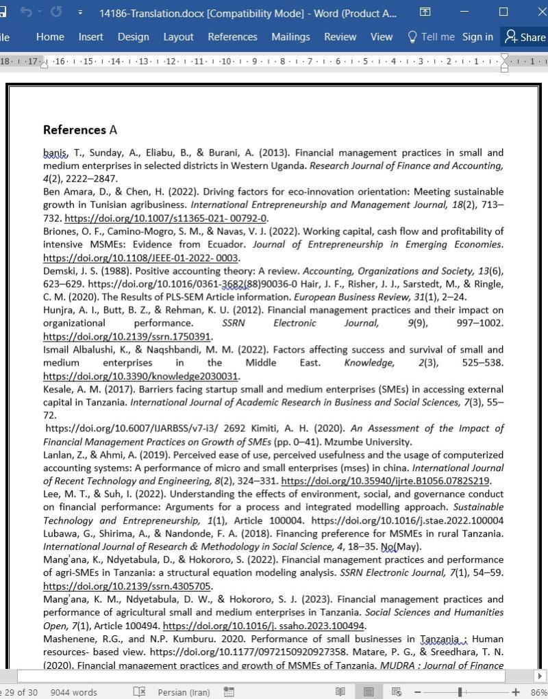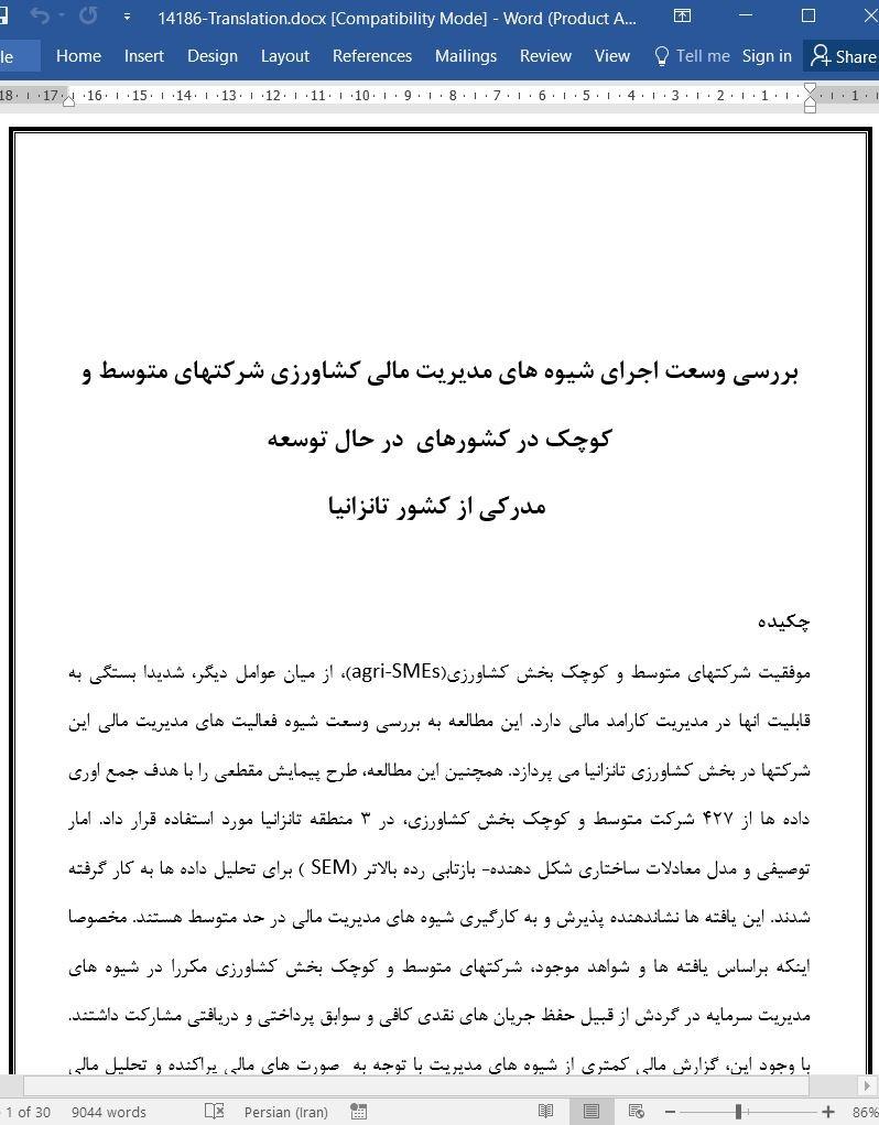 موفقیت شرکتهای متوسط و کوچک بخش کشاورزی(agri-SMEs)، از میان عوامل دیگر، شدیدا بستگی به قابلیت انها در مدیریت کارامد مالی دارد. این مطالعه به بررسی وسعت شیوه فعالیت های مدیریت مالی این شرکتها در بخش کشاورزی تانزانیا می پردازد. همچنین این مطالعه، طرح پیمایش مقطعی را با هدف جمع اوری داده ها از 427 شرکت متوسط و کوچک بخش کشاورزی، در 3 منطقه تانزانیا مورد استفاده قرار داد. امار توصیفی و مدل معادلات ساختاری شکل دهنده- بازتابی رده بالاتر (SEM ) برای تحلیل داده ها به کار گرفته شدند. این یافته ها نشاندهنده پذیرش و به کارگیری شیوه های مدیریت مالی در حد متوسط هستند. مخصوصا اینکه براساس یافته ها و شواهد موجود، شرکتهای متوسط و کوچک بخش کشاورزی مکررا در شیوه های مدیریت سرمایه در گردش از قبیل حفظ جریان های نقدی کافی و سوابق پرداختی و دریافتی مشارکت داشتند. با وجود این، گزارش مالی کمتری از شیوه های مدیریت با توجه به صورت های مالی پراکنده و تحلیل مالی صورت پذیرفته است. یافته های بیشتر نشاندهنده این می باشند که دیگر شیوه های مدیریت مالی از قبیل حسابداری مالی، بودجه بندی سرمایه ای و مدیریت تامین مالی ، به طور متوسط و به ندرت، با منابع مالی خارجی مورد استفاده قرار گرفتند، منابعی که در مقایسه با منابع مالی داخلی کمتر مورد استفاده قرار گرفتند. تحلیل مسیر این مورد را نشان می دهد که همه ساختارهای رده پایینتر به طرز چشمگیری با ساختار شیوه مدیریت مالی رده بالاتر ارتباط دارند که این مورد بیشترین تاثیر در بودجه بندی سرمایه ای را نشان می دهد. این یافته ها دلالت بر نیاز مبرم به ارتقا کیفی گزارش مالی ، تحلیل و استفاده از منبع خارجی مالی در شرکتهای متوسط و کوچک تانزانیا دارد. همچنین این یافته ها ارائه دهنده دیدگاه های ارزشمند شرکتهای کوچک و متوسط بخش کشاورزی با هدف به کار گیری استراتژی مناسب در جهت اجرای شیوه های مدیریت مالی می باشند که نتیجه ان موفقیت بیشتر در زمینه عملکرد مالی بهتر است.