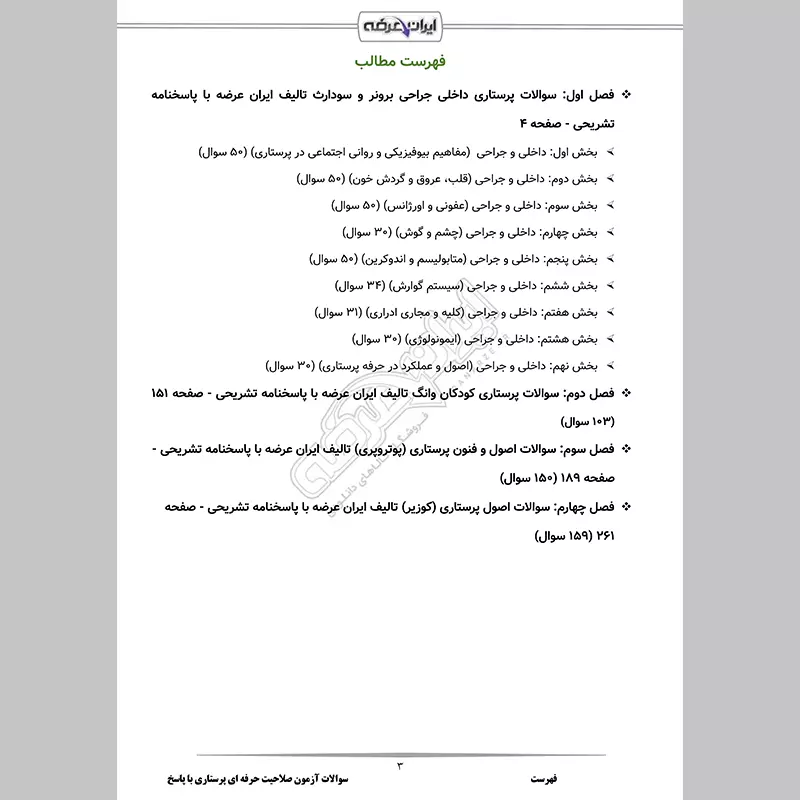 گروه آموزشی ایران عرضه اقدام به ارائه سوالات آزمون صلاحیت حرفه ای پرستاری نموده است. این بسته شامل سوالات استاندارد و طبقه بندی شده به همراه پاسخنامه تشریحی و قابلیت پرینت میباشد. کارشناسان ما بر این باورند که این مجموعه عاملی مهم برای آمادگی شما بوده و قدمی مهم برای موفقیت در آن خواهد بود.