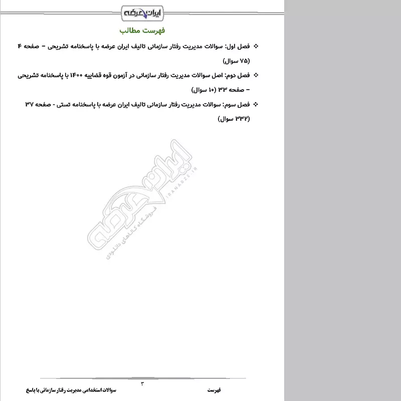 درس مهم مدیریت رفتار سازمانی در بسیاری از آزمون های استخدامی سراسری یکی از منابع اعلامی می باشد. برای آمادگی شما عزیزان برای این درس این بسته که حاوی نمونه سوالات طراحی شده مطابق سرفصل های آزمون های اخیر میباشد، توسط  گروه ایران عرضه تهیه و در اختیار بازدیدکنندگان عزیز قرار گرفته است. همچنین از سایر مزیت های اصلی این بسته ارائه اصل سوالات درس مدیریت رفتار سازمانی در آزمون قوه قضاییه 1400 می باشد. این بسته برای تمامی آزمون های استخدامی دولتی و خصوصی که در آن درس مدیریت رفتار سازمانی به عنوان منبع اعلام شده است، مفید می باشد. شما همینک می توانید این محصول را از فروشگاه ایران عرضه خریداری و دانلود نمایید و با مطالعه آن هر چه بیشتر آماده آزمون شوید.