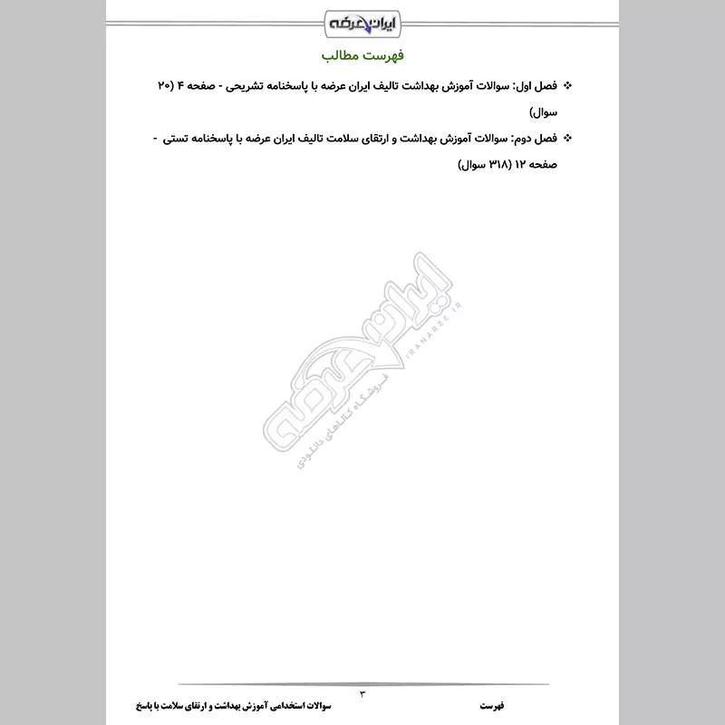 یکی از مباحث مهم استخدامی مراقبت سلامت مبحث آموزش بهداشت و ارتقای سلامت می باشد که در بسیاری از آزمون های استخدامی سراسری یکی از منابع اعلامی می باشد. برای آمادگی شما عزیزان برای این درس این بسته که حاوی اصل سوالات و نمونه سوالات طراحی شده مطابق سرفصل های سازمان سنجش میباشد، توسط گروه ایران عرضه تهیه و در اختیار بازدیدکنندگان عزیز قرار گرفته است. این بسته برای تمامی آزمون های استخدامی دولتی و خصوصی (آموزش و پرورش، دستگاه های اجرایی، سایر سازمان ها) که در آن درس آموزش بهداشت و ارتقای سلامت به عنوان منبع اعلام شده است، مفید می باشد. شما همینک می توانید این محصول را از فروشگاه ایران عرضه خریداری و دانلود نمایید و با مطالعه آن هر چه بیشتر آماده آزمون شوید.