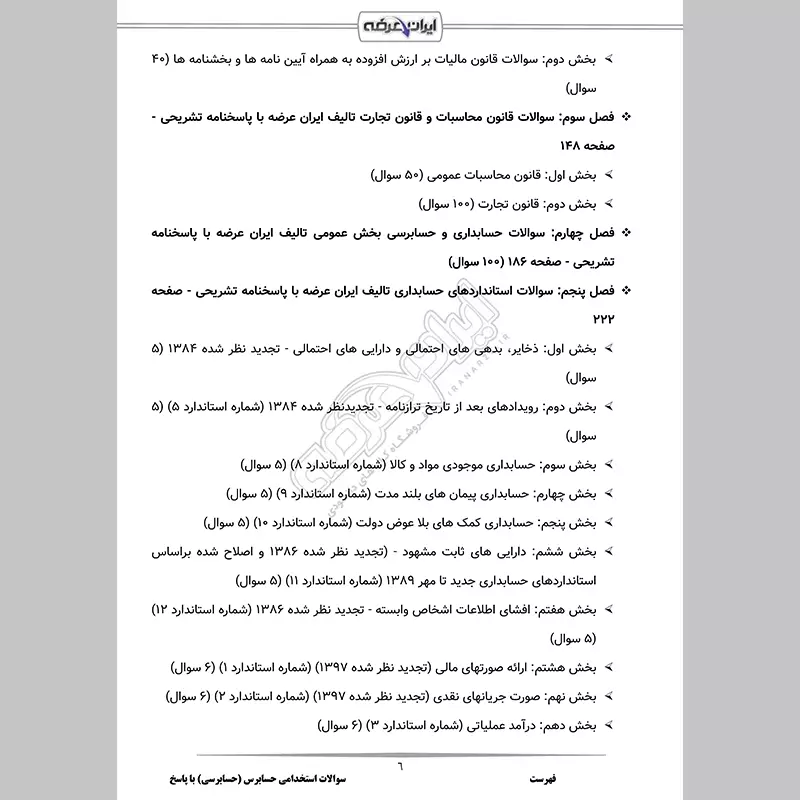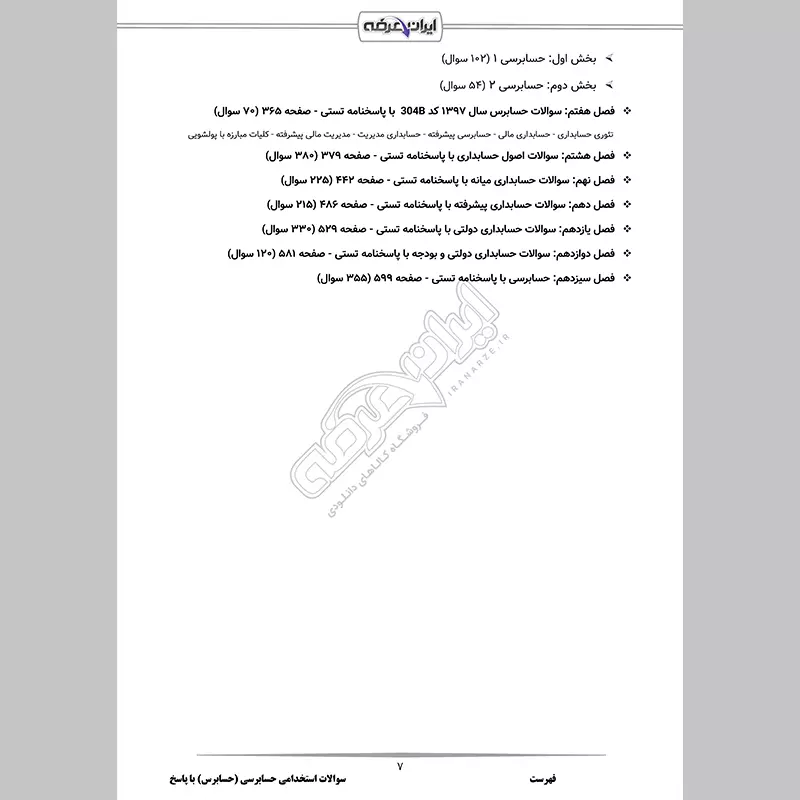 گروه آموزشی ایران عرضه اقدام به ارائه جزوات و سوالات حسابرسی منطبق با منابع اعلامی سازمان جهاد دانشگاهی نموده است. جهت آمادگی برای آزمون استخدامی حسابرسی در سال 1404 این بسته سوالات آماده شده است که شامل سوالات طراحی شده توسط کارشناسان خبره بر اساس منابع اعلام شده جدید می باشد. این بسته شامل سوالات حیطه تخصصی با پاسخنامه تشریحی و قابلیت پرینت برای مطالعه آسان میباشد که با حل این سوالات، به طور کامل با سبک سوالات آزمون آشنا میشوید. کارشناسان ما بر این باورند که این مجموعه عاملی مهم برای آمادگی شما در این آزمون بوده و قدمی مهم برای موفقیت در آن خواهد بود.