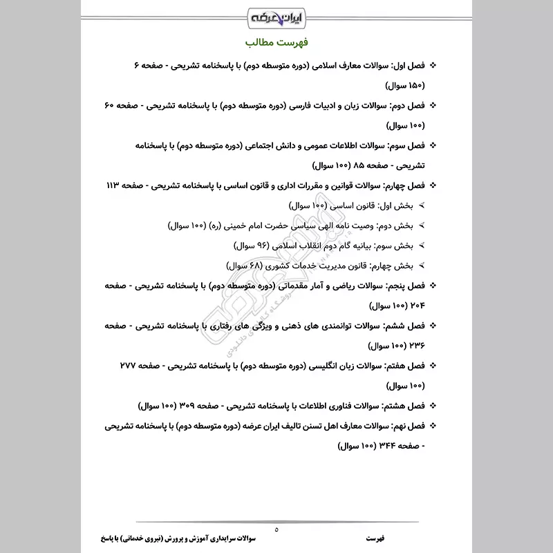 گروه آموزشی ایران عرضه اقدام به ارائه بسته ای کارآمد و مفید برای آمادگی در آزمون استخدامی سرایداری آموزش و پرورش (نیروی خدماتی) نموده است. از مزیت های اصلی این بسته بهره گیری از اصل سوالات آزمون های استخدامی ادوار گذشته آموزش و پرورش، فراگیر و سایر سازمان های دولتی می باشد. همچنین از سایر مزیت های این بسته ارائه سوالات کلیدی مهم و پرتکرار به همراه پاسخنامه کاملا تشریحی در قالب فایل PDF قابل پرینت است. در نظر داشته باشید که قدم اول برای استخدام، مطالعه هدفمند مطالب مهم است، لذا پیشنهاد می کنیم با خرید محصولات باکیفیت و اثربخش ایران عرضه موفقیت خود را در آزمون استخدامی نیروی خدمتگزار آموزش و پرورش تضمین کنید.
