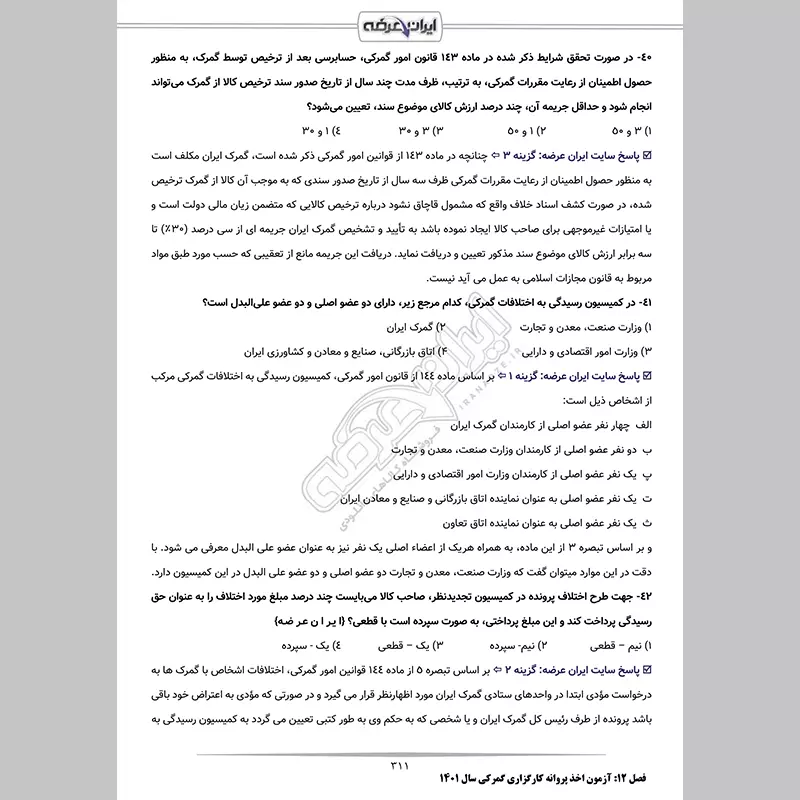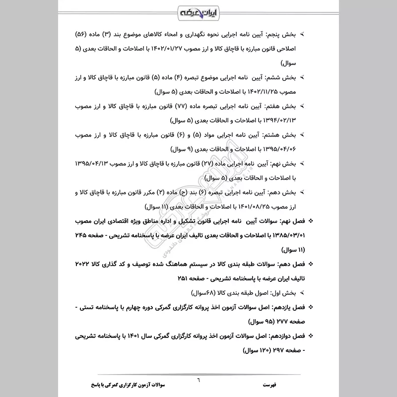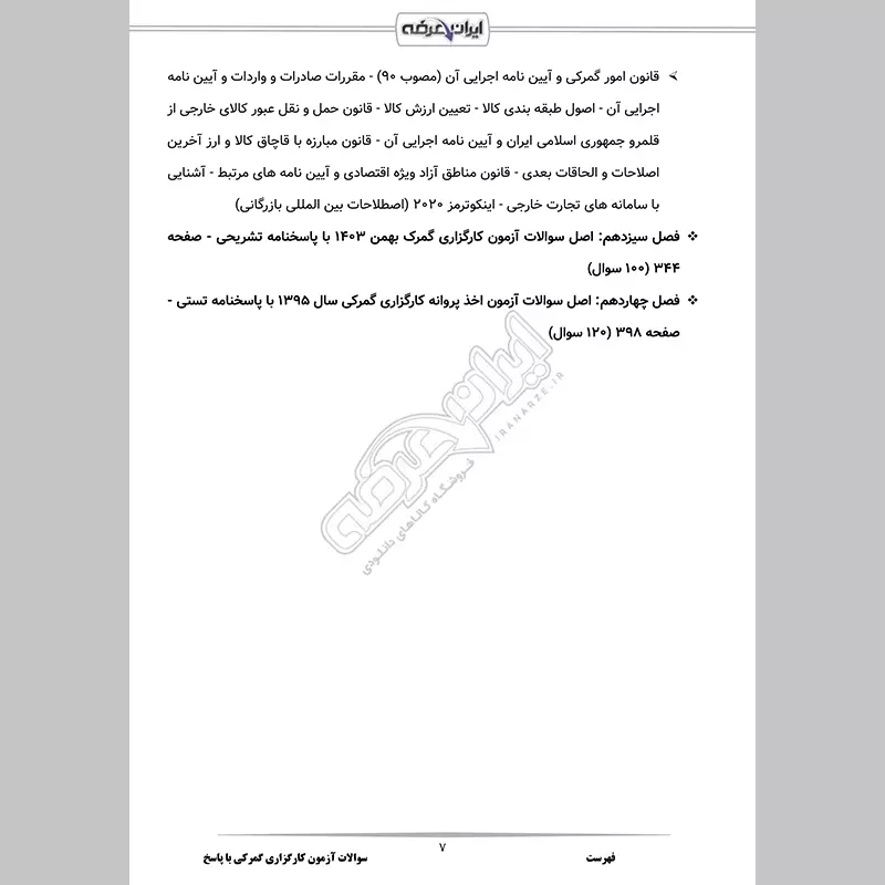 گروه آموزشی ایران عرضه اقدام به ارائه سوالات برای آزمون اخذ پروانه کارگزاری گمرکی نموده است. این مجموعه حاوی نمونه سوالات استاندارد و طبقه بندی شده به همراه پاسخنامه تشریحی دقیق و کامل است. از سایر مزیت های اصلی این بسته دارا بودن اصل سوالات آزمون های ادوار گذشته است. کارشناسان ما بر این باورند که این مجموعه عاملی مهم برای آمادگی شما امتحان حق العمل کاری و کارت بازرگانی بوده و قدمی مهم برای موفقیت در آن خواهد بود. با این پکیج، نه تنها به سوالات آزمون مسلط میشوید، بلکه مهارت های خود را نیز ارتقا می دهید و با آمادگی بیشتر و خیالی آسوده در آزمون شرکت خواهید کرد.