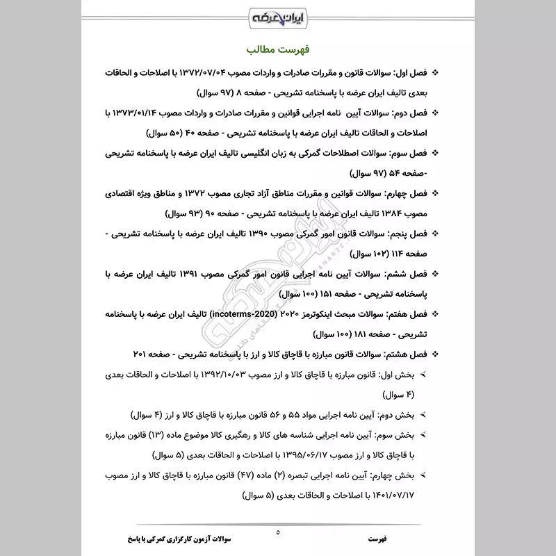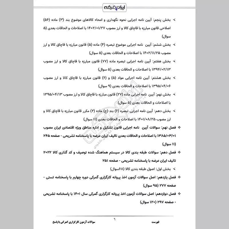 - فصل 6: سوالات آیین نامه اجرایی قانون امور گمرکی مصوب 1391 تالیف ایران عرضه - صفحه 151 (100 سوال)