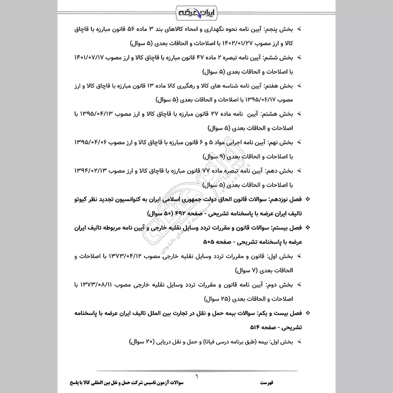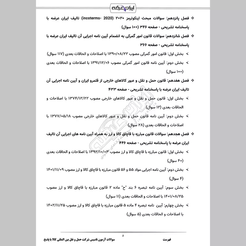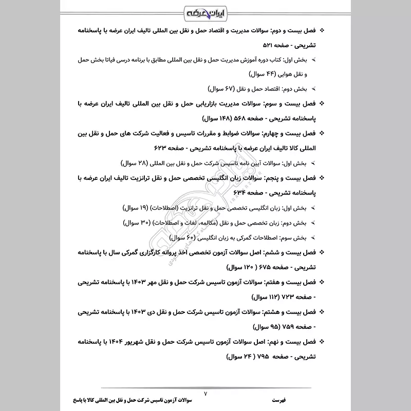 گروه آموزشی فروشگاه اینترنتی ایران عرضه اقدام به ارائه بسته ای استثنایی و جدید برای آزمون تاسیس و فعالیت شرکت های حمل و نقل بین المللی کالا نموده است، این مجموعه شامل سوالات تالیفی ایران عرضه به همراه پاسخنامه تشریحی با قابلیت پرینت میباشد. کارشناسان ما بر این باورند که این مجموعه عاملی مهم برای آمادگی شما در این آزمون بوده و قدمی مهم برای موفقیت در آن خواهد بود.همچنین این محصول شامل سوالات تالیفی است که تمامی مباحث آزمون را پوشش می دهد. از ویژگی های دیگر این محصول قابلیت پرینت برای مطالعه آسان و پاسخنامه تشریحی برای درک عمیق مطالب است.