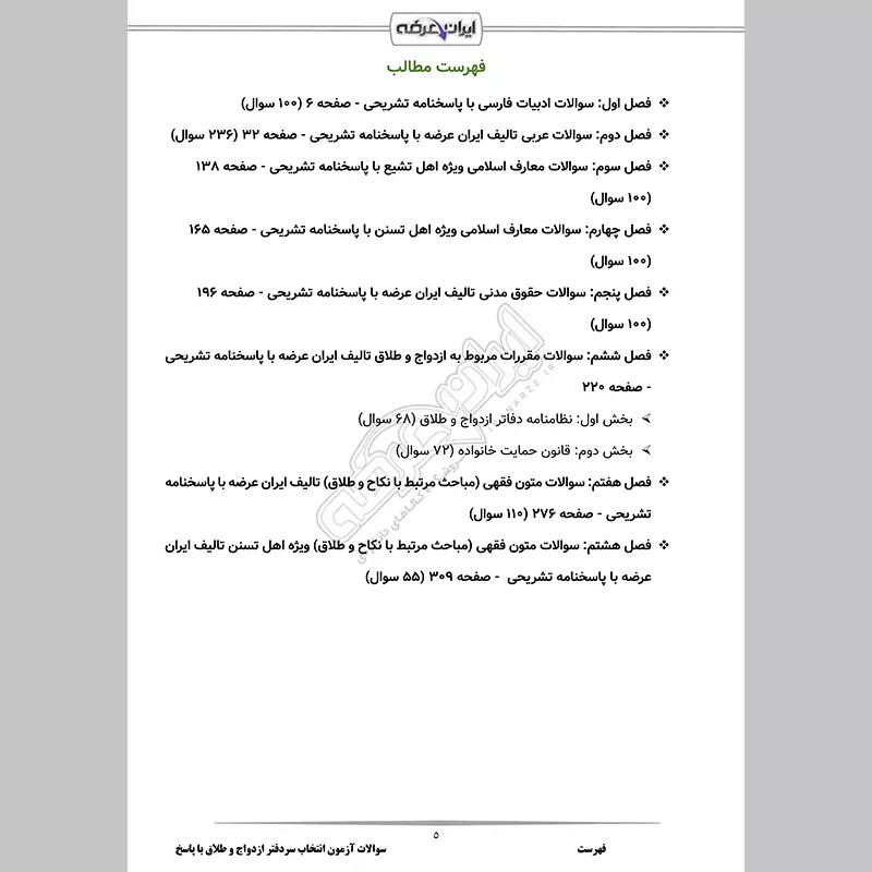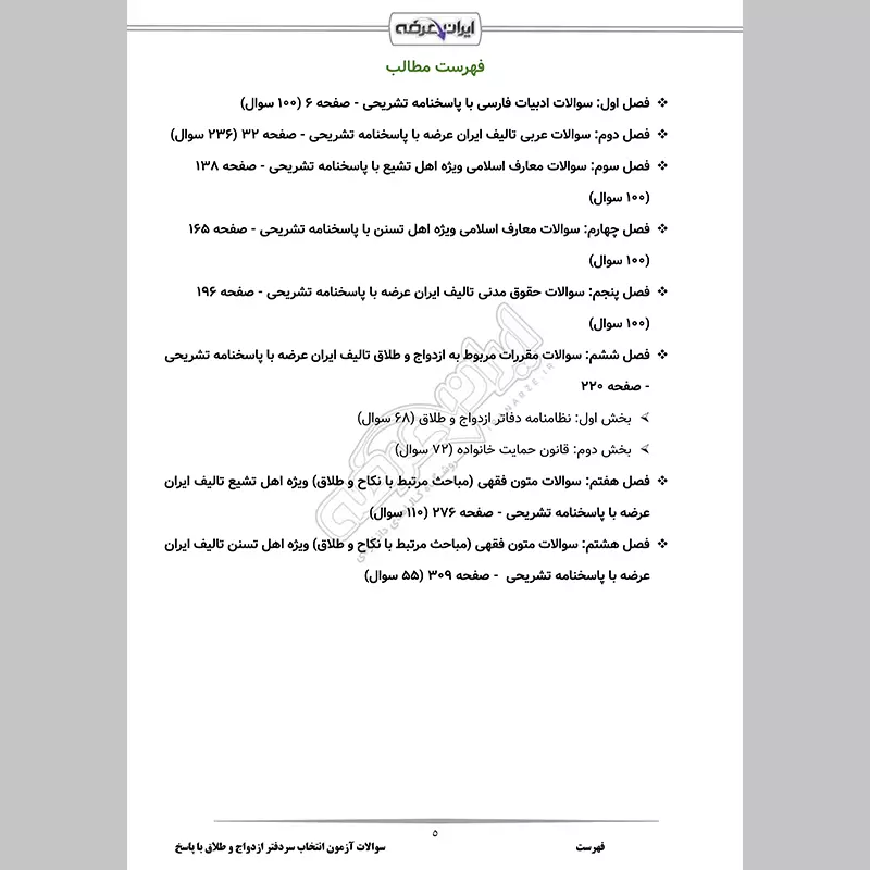گروه آموزشی ایران عرضه اقدام به ارائه بسته ای جدید برای آمادگی در آزمون انتخاب سردفتر ازدواج و طلاق نموده است. این مجموعه شامل سوالات استاندارد و طبقه بندی شده همراه با پاسخنامه تشریحی جامع و دقیق می باشد. از سایر مزیت های اصلی این بسته دارا بودن قابلیت پرینت در فایل جهت مطالعه مطالعه آسان است. کارشناسان ما بر این باورند که این مجموعه عاملی مهم برای آمادگی شما در این آزمون بوده و قدمی مهم برای موفقیت در آن خواهد بود. با حل این سوالات، به طور کامل به سبک سوالات آزمون مسلط میشوید. ما به کیفیت محصولات خود اطمینان داریم و کارشناسان ما به شما کمک میکنند تا نقاط قوت و ضعف خود را شناسایی کرده و بر روی آنها کار کنید و بیش از پیش خود را برای آزمون آماده سازید.