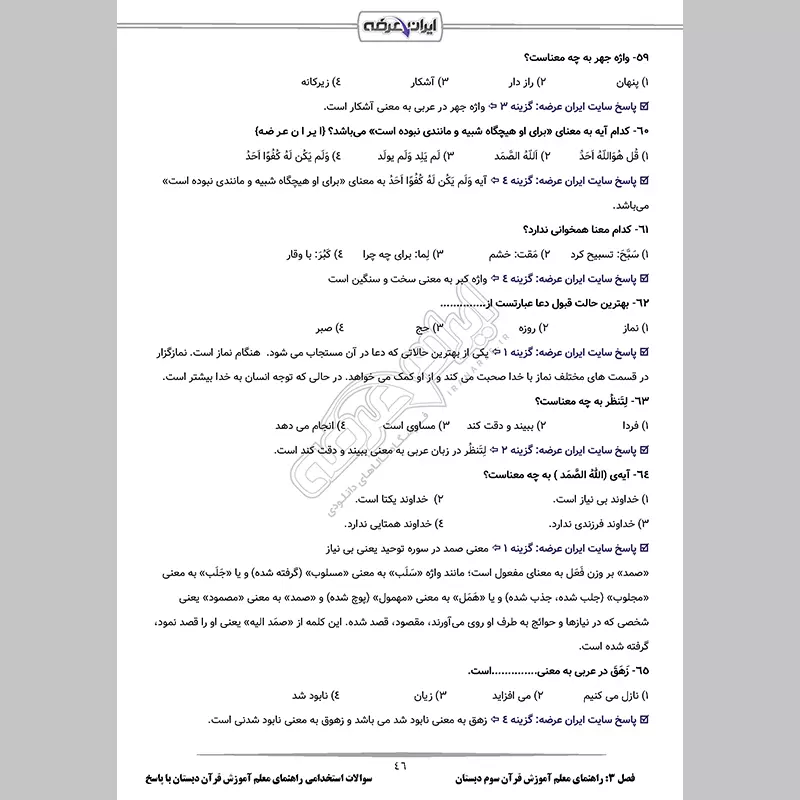 - فصل 3: سوالات راهنمای معلم آموزش قرآن سوم دبستان آموزگار ابتدایی – صفحه 35 (76 سوال)