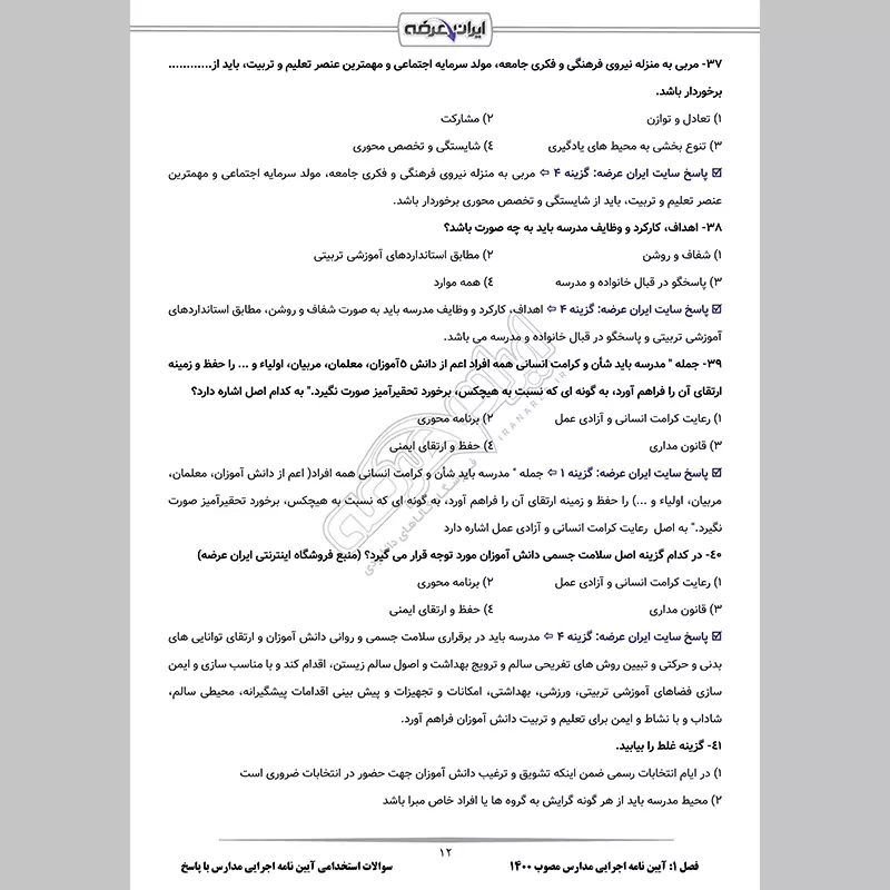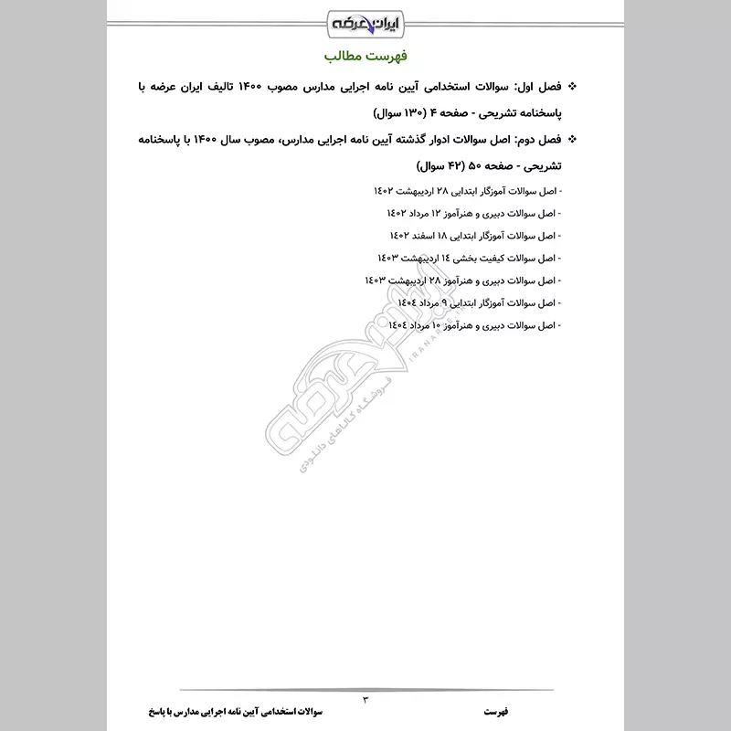 - فصل 1: سوالات استخدامی آیین نامه اجرایی مدارس مصوب 1400 تالیف ایران عرضه - صفحه 4 (130 سوال)