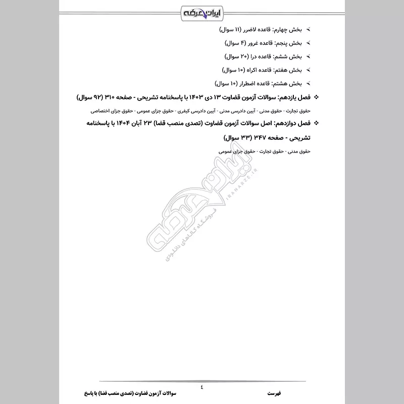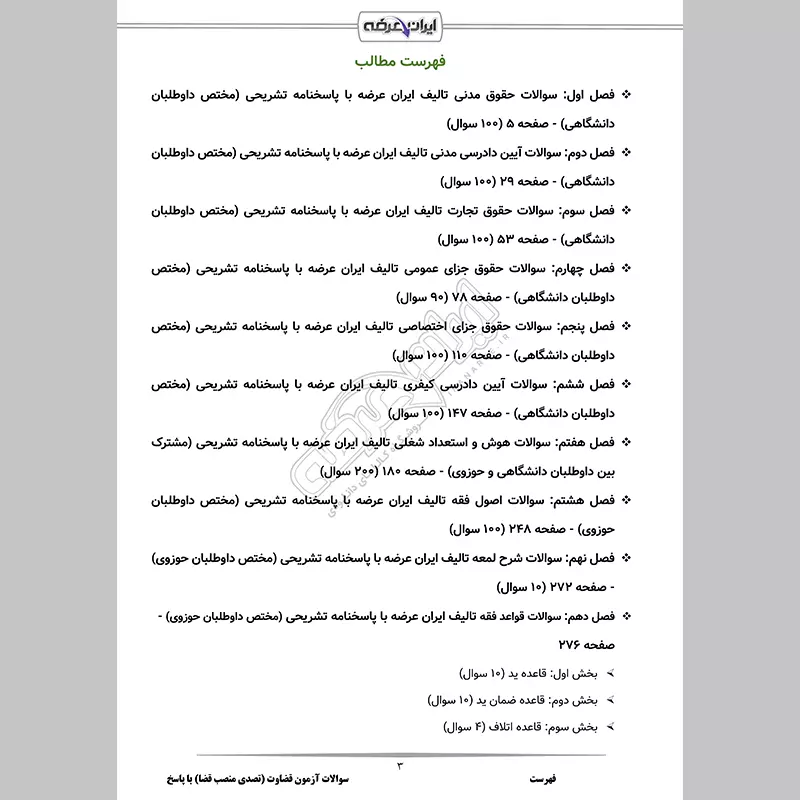 گروه آموزشی ایران عرضه اقدام به ارائه سوالات آزمون قضاوت (تصدی منصب قضا) نموده است. این بسته شامل سوالات تألیفی استاندارد و طبقه بندی شده با پاسخنامه تشریحی دقیق و جامع با قابلیت پرینت میباشد. از مزیت های اصلی این بسته ارائه اصل سوالات ادوار گذشته آزمون در سال های 1403 و 1404 می باشد. کارشناسان ما بر این باورند که این مجموعه عاملی مهم برای آمادگی شما در این آزمون بوده و با این بسته، مسیر موفقیت در آزمون هموار میشود.