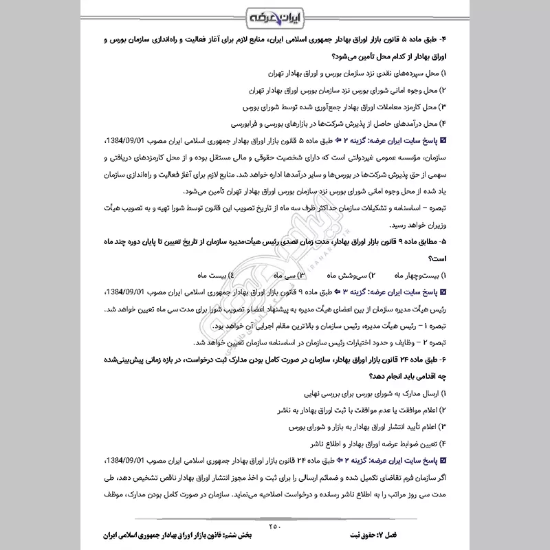 - بخش 6: قانون بازار اوراق بهادار جمهوری اسلامی ایران مصوب 01/09/1384 (به همراه اصلاحات تا 22/12/1402) (10 سوال)
