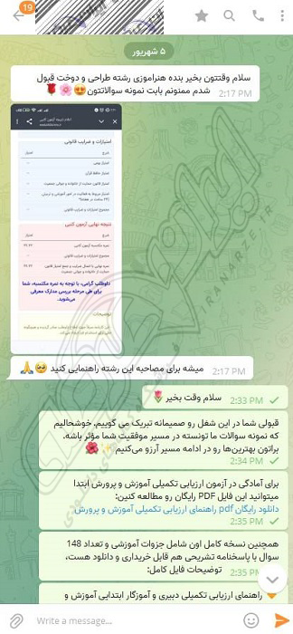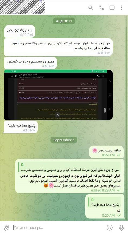رضایت و قبولی نهایی کاربر تلگرام از محصولات ایران عرضه برای آزمون استخدامی هنرآموز صنایع دستی آموزش و پرورش 10 مرداد 1404