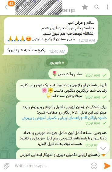 رضایت و قبولی کاربر تلگرام از محصولات ایران عرضه برای آزمون استخدامی آموزگار ابتدایی آموزش و پرورش 9 مرداد 1404