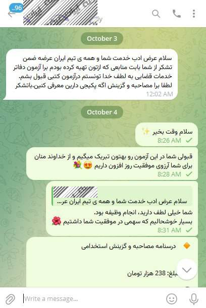 رضایت کاربر تلگرام از محصولات ایران عرضه برای آزمون دفاتر خدمات الکترونیک قضایی 3 مرداد 1404