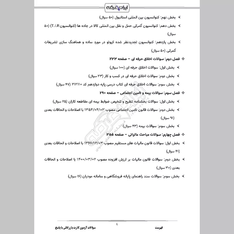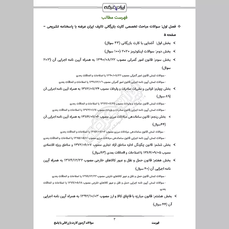 - بخش 4: قوانین و مقررات صادرات و واردات مصوب 1372/07/24 به همراه آیین نامه اجرایی آن (89 سوال)