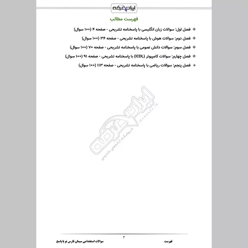 گروه آموزشی ایران عرضه اقدام به ارائه بسته ای جدید و مطابق با منابع عمومی اعلام شده برای آزمون استخدامی سیمان فارس نو نموده است. این مجموعه شامل سوالات تألیفی استاندارد و طبقهبندی شده به همراه پاسخنامه تشریحی دقیق و کامل می باشد. از سایر مزیت های این بسته دارا بودن قابلیت پرینت در فایل برای مطالعه آسان است. ما به کیفیت محصولات خود اطمینان داریم. حل این سوالات باعث می شود که به طور کامل به سبک سوالات آزمون مسلط شوید و نقاط قوت و ضعف خود را شناسایی کنید. کارشناسان ما بر این باورند که این مجموعه عاملی مهم برای آمادگی شما در این آزمون بوده و قدمی مهم برای موفقیت در آن خواهد بود.