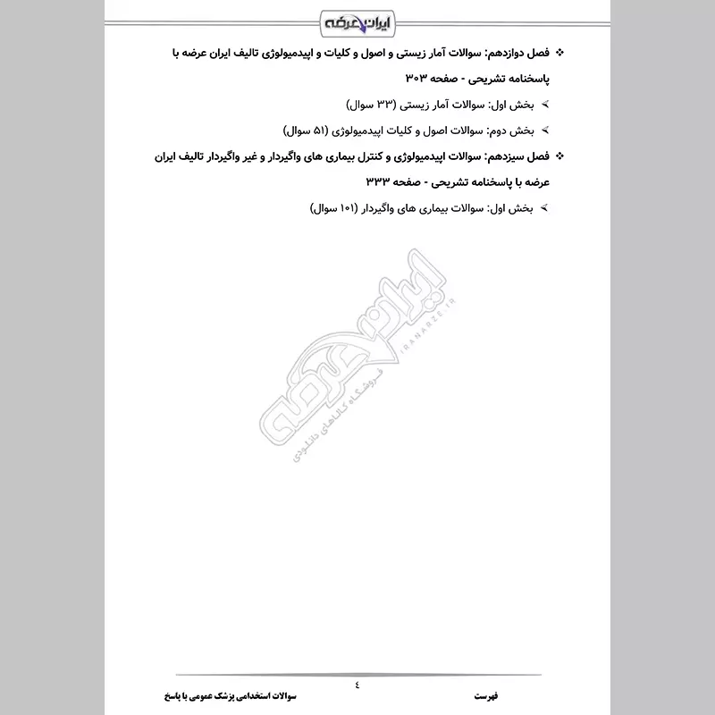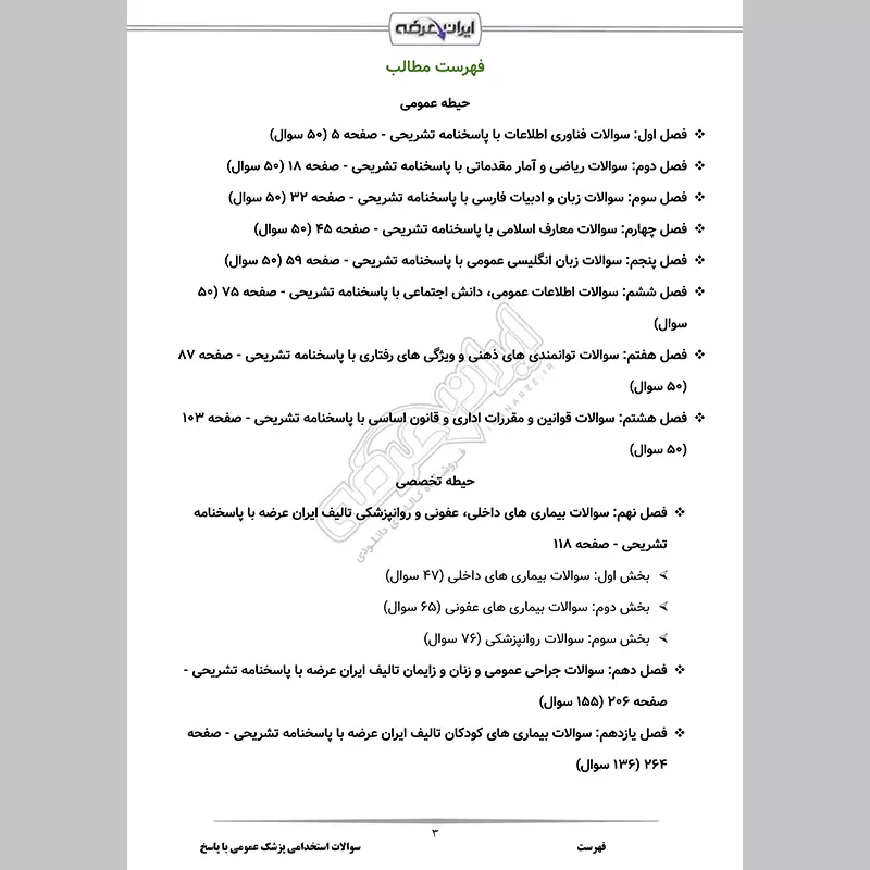 گروه آموزشی ایران عرضه اقدام به ارائه بسته ای جدید برای نمونه سوالات آزمون استخدامی پزشک عمومی در سازمان های مختلفی مثل وزارت بهداشت، تامین اجتماعی و ... نموده است. این مجموعه شامل سوالات تالیفی ایران عرضه با قابلیت پرینت و دارای پاسخنامه میباشد. کارشناسان ما بر این باورند که این مجموعه عاملی مهم برای آمادگی شما در این آزمون بوده و قدمی مهم برای موفقیت در آن خواهد بود.با حل این سوالات، به طور کامل به سبک سوالات آزمون مسلط میشوید.