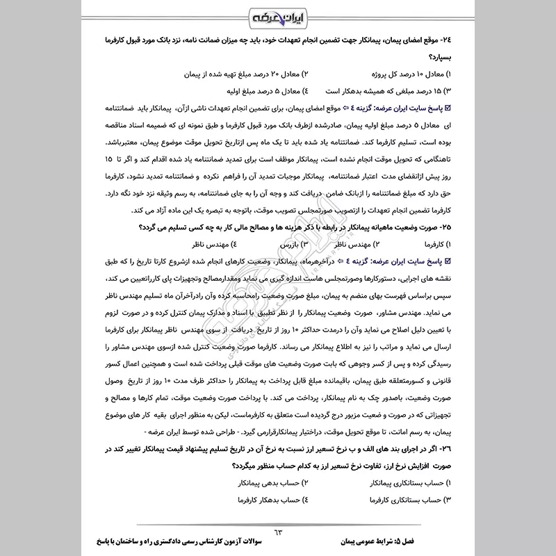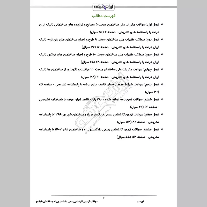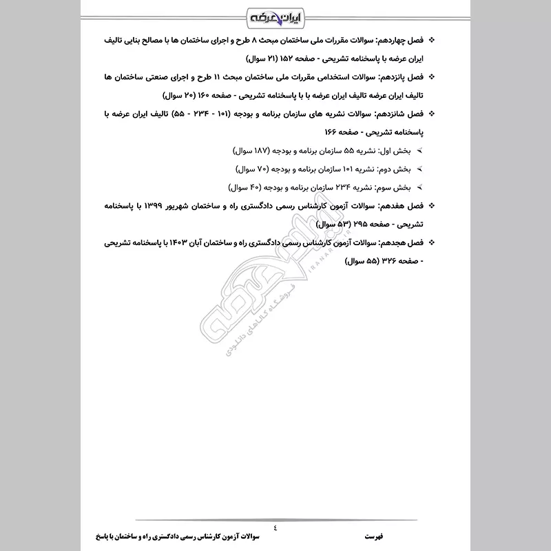 گروه آموزشی ایران عرضه اقدام به ارائه سوالات آزمون کارشناس رسمی دادگستری رشته راه و ساختمان نموده است. این بسته شامل سوالات تالیفی حیطه تخصصی با پاسخنامه تشریحی و قابلیت پرینت میباشد. از مزیت های اصلی این بسته دارا بودن اصل سوالات آزمون های ادوار گذشته می باشد. کارشناسان ما بر این باورند که این مجموعه عاملی مهم برای آمادگی شما در این آزمون بوده و قدمی مهم برای موفقیت در آن خواهد بود.