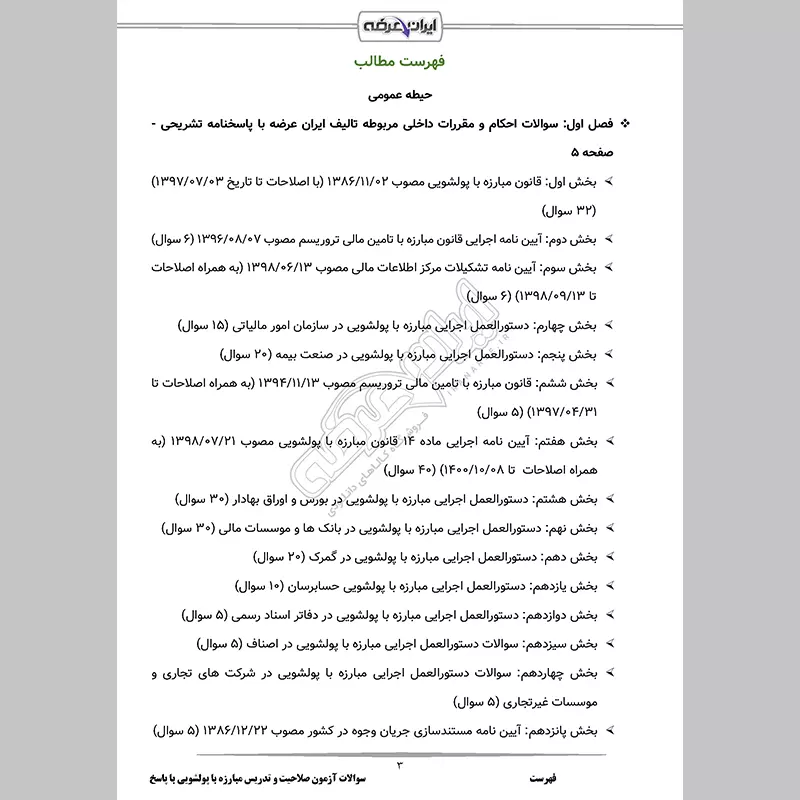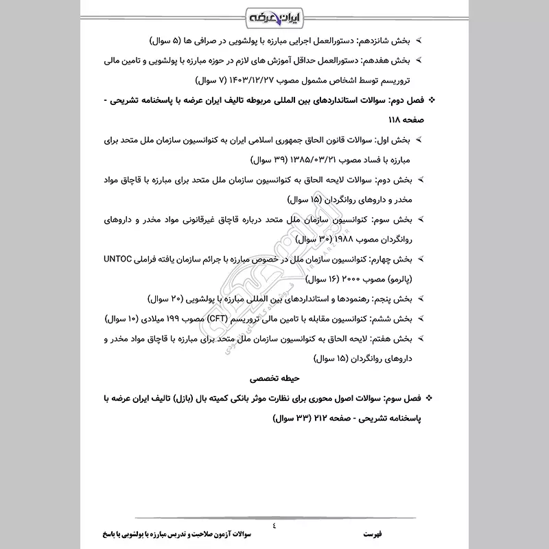 گروه آموزشی ایران عرضه اقدام به ارائه سوالات آزمون اخذ گواهی صلاحیت و گواهی تدریس در حوزه مبارزه با پولشویی و تامین مالی تروریسم مرکز اطلاعات مالی نموده است. این بسته شامل نمونه سوالات آزمون اخذ گواهی صلاحیت و گواهی تدریس در حوزه مبارزه با پولشویی و تامین مالی تروریسم مرکز اطلاعات مالی به همراه پاسخنامه تشریحی با قابلیت پرینت میباشد. کارشناسان ما بر این باورند که این مجموعه عاملی مهم برای آمادگی شما در این آزمون بوده و قدمی مهم برای موفقیت در آن خواهد بود.