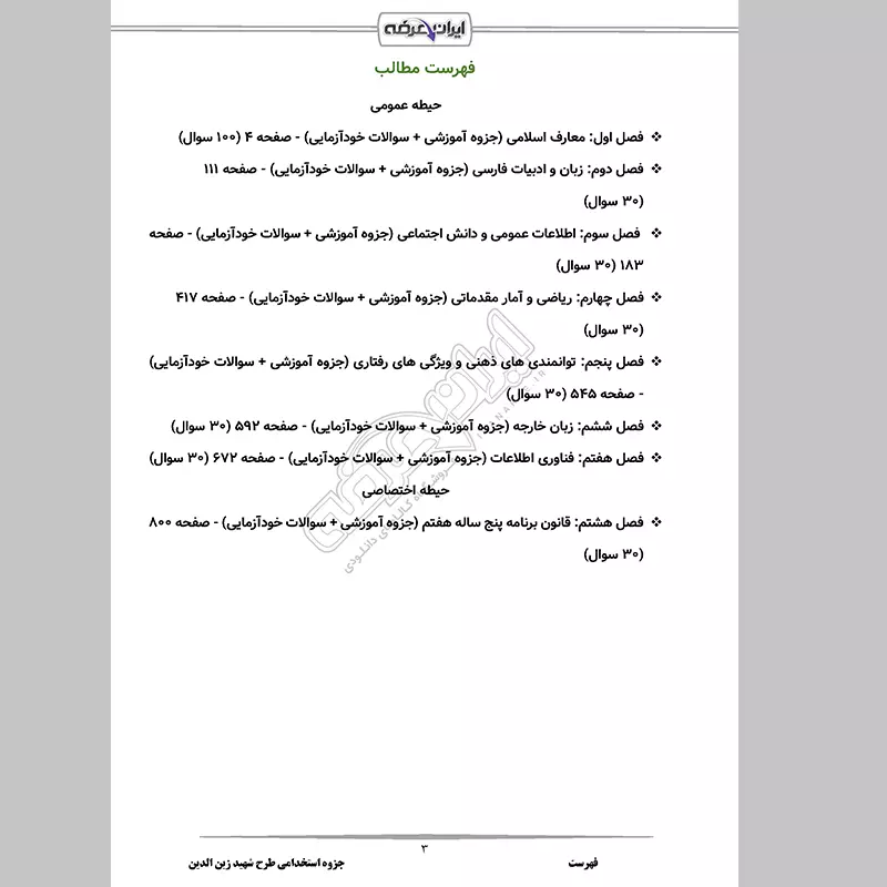گروه آموزشی ایران عرضه اقدام به ارائه بسته ای جدید برای درسنامه آزمون استخدامی طرح شهید زین الدین نموده است. این محصول شامل جزوه آموزشی، نکات مهم و سوالات خودآزمایی آزمون استخدامی طرح شهید زین الدین می باشد که در دو نسخه pdf و چاپی قابل دریافت است. کارشناسان ما بر این باورند که این مجموعه عاملی مهم برای آمادگی شما در این آزمون بوده و قدمی مهم برای موفقیت در آن خواهد بود. با مطالعه این درسنامه، در زمان کوتاه مهم ترین مطالب منابع آزمون طرح شهید زین الدین را فرا خواهید گرفت.
