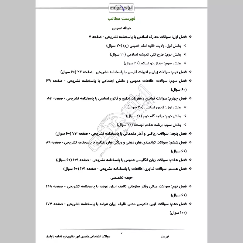پاسخسلام وقت بخیر. در حال حاضر بسته شامل نمونه سوالات عمومی و تخصصی تالیف ایران عرضه به همراه اصل سوالات ادوار گذشته با پاسخنامه می باشد.