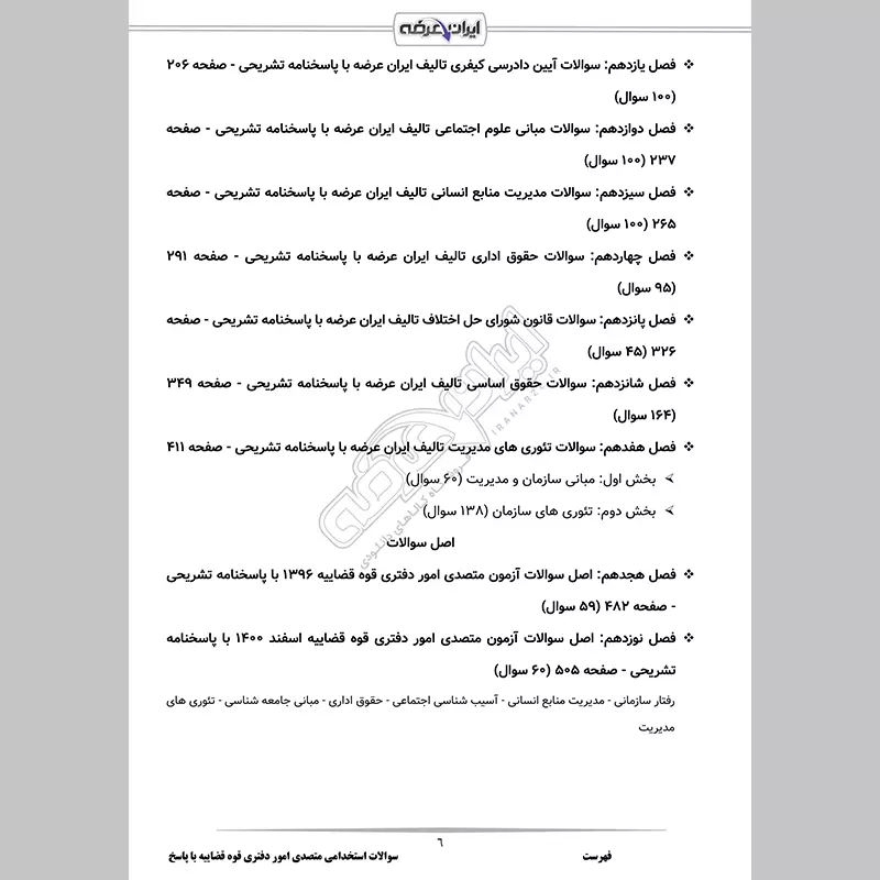 گروه آموزشی معتبر ایران عرضه اقدام به ارائه سوالات آزمون استخدامی متصدی امور دفتری قوه قضاییه نموده است. از مزیت های اصلی این بسته دارا بودن اصل سوالات حیطه عمومی ادوار گذشته به همراه سوالات تالیفی حیطه تخصصی در قالب فایل PDF با پاسخنامه تشریحی کامل و دقیق است. همچنین از سایر مزیت های این بسته دارا بودن قابلیت پرینت در فایل میباشد. به شما پیشنهاد می کنیم از این فرصت طلایی استفاده کنید و با خرید و مطالعه این بسته کیفیت مطالعه خود را افزایش دهید. کارشناسان ما بر این باورند که این مجموعه عاملی مهم برای آمادگی شما در این آزمون بوده و قدمی مهم برای موفقیت در آن خواهد بود.
