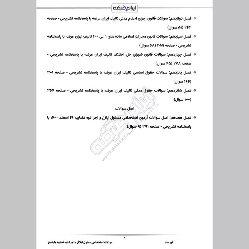 گروه آموزشی ایران عرضه اقدام به ارائه سوالات آزمون استخدامی مسئول ابلاغ و اجرا قوه قضاییه نموده است. این بسته شامل اصل سوالات حیطه عمومی ادوار گذشته به همراه سوالات تالیفی حیطه تخصصی با پاسخنامه تشریحی و قابلیت پرینت میباشد. کارشناسان ما بر این باورند که این مجموعه عاملی مهم برای آمادگی شما در این آزمون بوده و قدمی مهم برای موفقیت در آن خواهد بود.