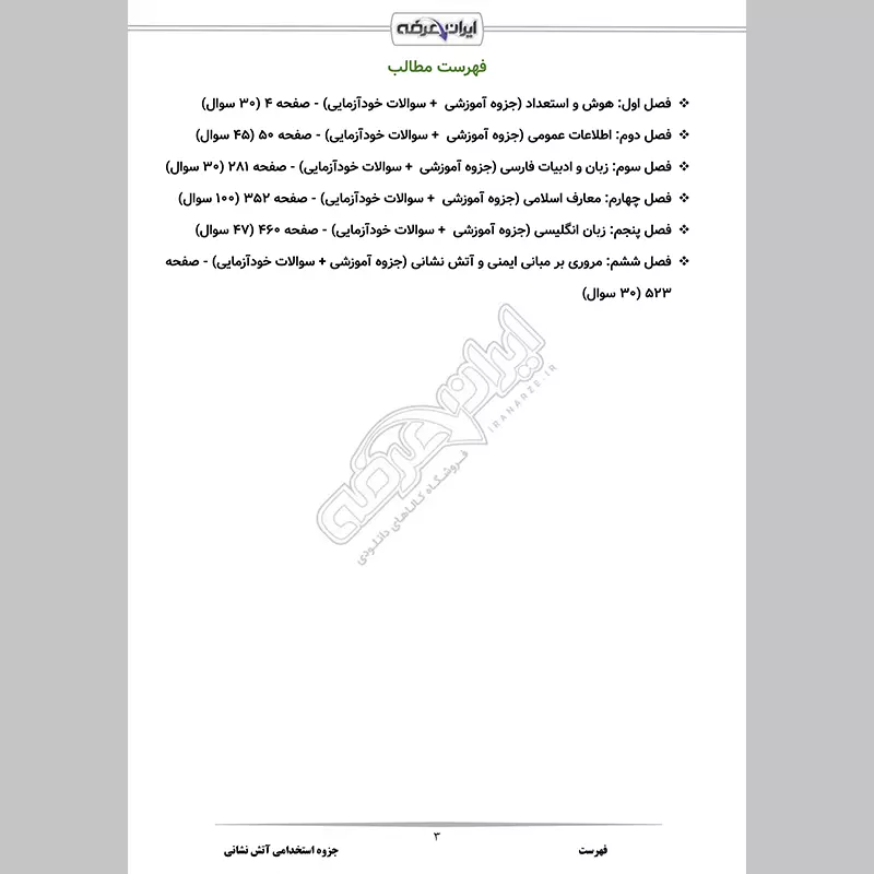 گروه آموزشی ایران عرضه اقدام به ارائه بسته ای جدید برای درسنامه آزمون استخدامی آتش نشانی نموده است. این محصول شامل جزوه آموزشی، نکات مهم و سوالات خودآزمایی آزمون استخدامی آتش نشانی می باشد که در دو نسخه pdf و چاپی قابل دریافت است. کارشناسان ما بر این باورند که این مجموعه عاملی مهم برای آمادگی شما در این آزمون بوده و قدمی مهم برای موفقیت در آن خواهد بود. با مطالعه این جزوه آموزشی در زمان کوتاه مهم ترین مطالب منابع آزمون استخدامی متصدی امور دفتری قوه قضاییه را فرا خواهید گرفت.