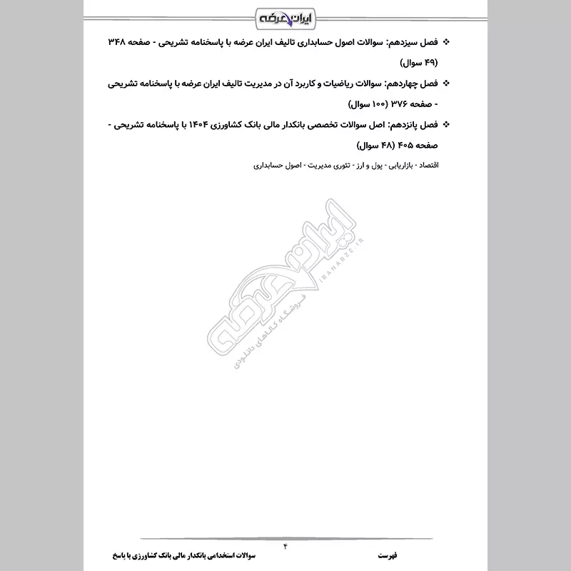 گروه آموزشی ایران عرضه اقدام به ارائه سوالات آزمون استخدامی بانکدار گروه مالی بانک کشاورزی نموده است. این بسته شامل سوالات عمومی و تخصصی استاندارد و طبقه بندی شده طبق منابع اعلام شده، با پاسخنامه کاملا تشریحی میباشد. از سایر مزیت های این بسته دارا بودن قابلیت پرینت در فایل pdf جهت مطالعه راحت تر می باشد. ما به کیفیت محصولات خود اطمینان داریم به همین دلیل کارشناسان ما بر این باورند که این مجموعه عاملی مهم برای آمادگی شما در آزمون استخدامی بانکدار رشته مالی بانک کشاورزی بوده و قدمی مهم برای موفقیت در آن خواهد بود.