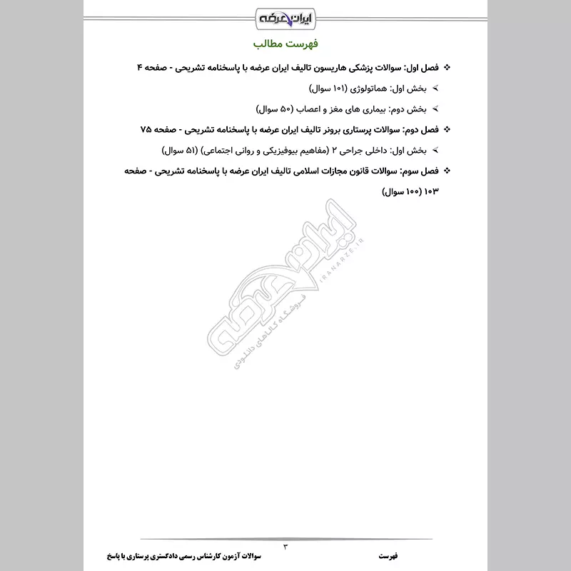 گروه آموزشی ایران عرضه اقدام به ارائه سوالات آزمون کارشناس رسمی دادگستری رشته پرستاری نموده است. این بسته شامل سوالات تالیفی استاندارد و میکرو طبقه بندی شده حیطه تخصصی با پاسخنامه کاملا تشریحی میباشد. همچنین از سایر مزیت های این بسته دارا بودن قابلیت پرینت در فایل جهت مطالعه آسان است. کارشناسان ما بر این باورند که این مجموعه عاملی مهم برای آمادگی شما در این آزمون بوده و قدمی مهم برای موفقیت در آن خواهد بود
