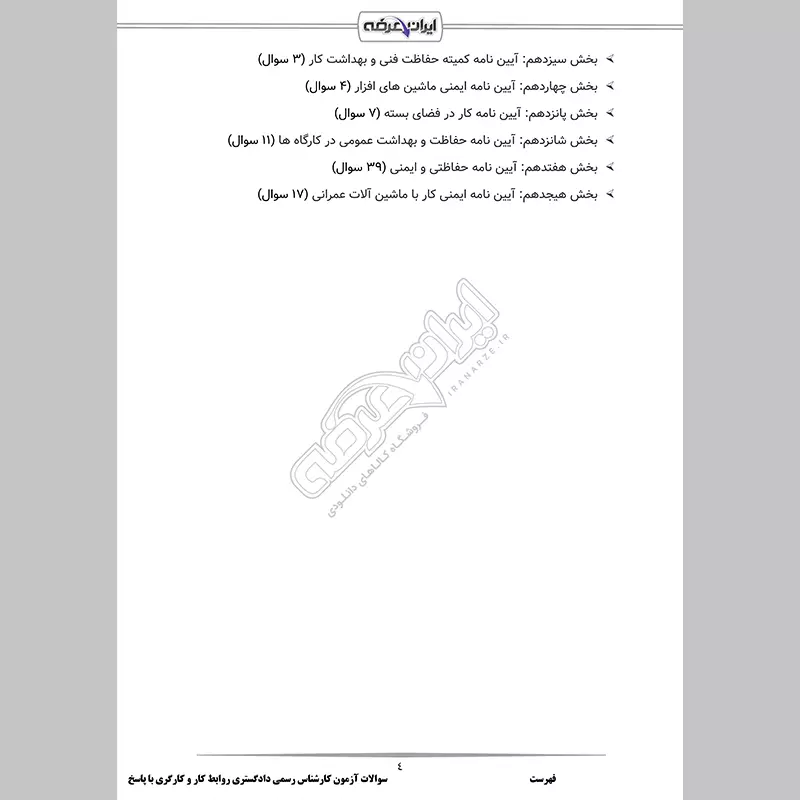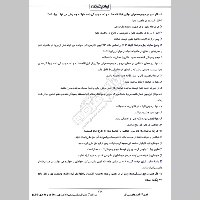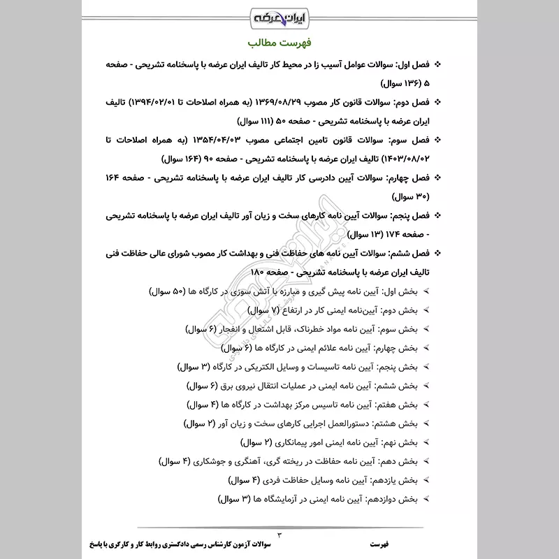 گروه آموزشی ایران عرضه اقدام به ارائه سوالات آزمون کارشناس رسمی دادگستری رشته روابط کار و کارگری نموده است. این بسته شامل سوالات تالیفی استاندارد و طبقه بندی شده حیطه تخصصی با پاسخنامه کاملا تشریحی میباشد. از سایر مزیت های این بسته دارا بودن قابلیت پرینت و هایلایت کردن متون در فایل است. ما به کیفیت محصولات خود اطمینان داریم، لذا کارشناسان ما بر این باورند که خرید و مطالعه این بسته عاملی مهم برای آمادگی شما در این آزمون بوده و قدمی مهم برای موفقیت در آن خواهد بود.