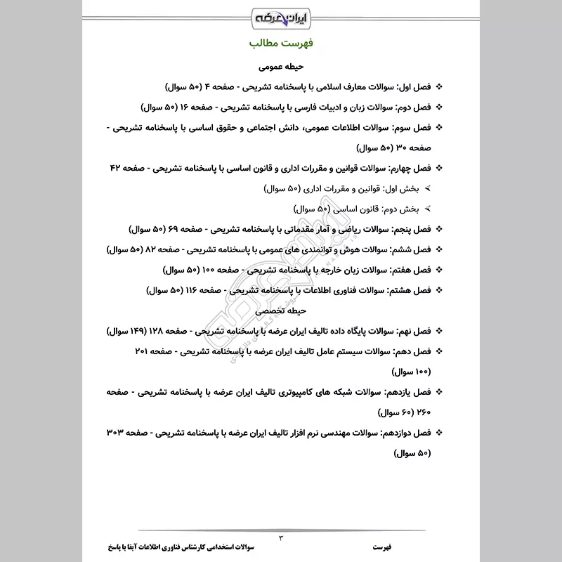 گروه آموزشی ایران عرضه اقدام به ارائه سوالات آزمون استخدامی کارشناس فناوری اطلاعات شرکت آب و فاضلاب نموده است. این بسته شامل سوالات عمومی و تخصصی با پاسخنامه تشریحی و قابلیت پرینت برای آزمون استخدامی کارشناس فناوری اطلاعات شرکت آب و فاضلاب میباشد. کارشناسان ما بر این باورند که این مجموعه عاملی مهم برای آمادگی شما در این آزمون بوده و قدمی مهم برای موفقیت در آن خواهد بود.
