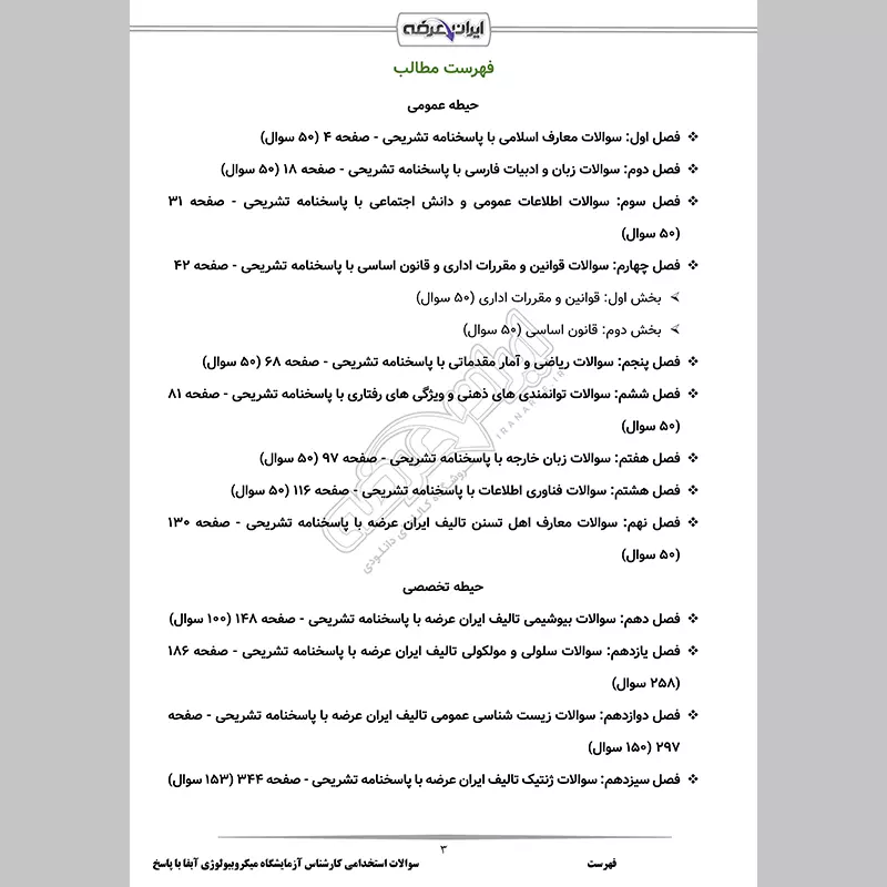گروه آموزشی ایران عرضه اقدام به ارائه سوالات آزمون استخدامی کارشناس آزمایشگاه میکروبیولوژی شرکت آب و فاضلاب نموده است. این بسته شامل سوالات استاندارد و میکرو طبقه بندی شده حیطه عمومی و تخصصی با پاسخنامه تشریحی دقیق و جامع می باشد. همچنین از سایر مزیت های این بسته دارا بودن قابلیت پرینت در فایل جهت مطالعه آسان است. کارشناسان ما بر این باورند که این مجموعه عاملی مهم برای آمادگی شما در این آزمون بوده و قدمی مهم برای موفقیت در آن خواهد بود؛ لذا به شما پیشنهاد می کنیم با خرید و مطالعه این بسته از این فرصت طلایی استفاده کرده و موفقیت خود در آزمون را تضمین کنید.