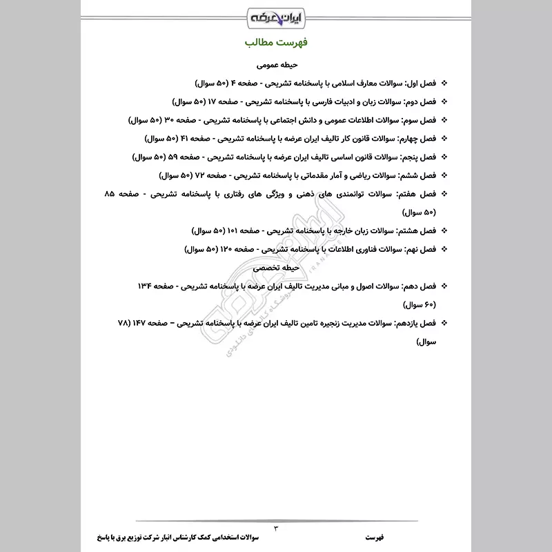 گروه آموزشی ایران عرضه اقدام به ارائه سوالات آزمون استخدامی کمک کارشناس انبار شرکت توزیع برق نموده است. این بسته شامل سوالات عمومی و تخصصی با پاسخنامه تشریحی و قابلیت پرینت برای آزمون استخدامی کمک کارشناس انبار شرکت توزیع برق میباشد. کارشناسان ما بر این باورند که این مجموعه عاملی مهم برای آمادگی شما در این آزمون بوده و قدمی مهم برای موفقیت در آن خواهد بود.