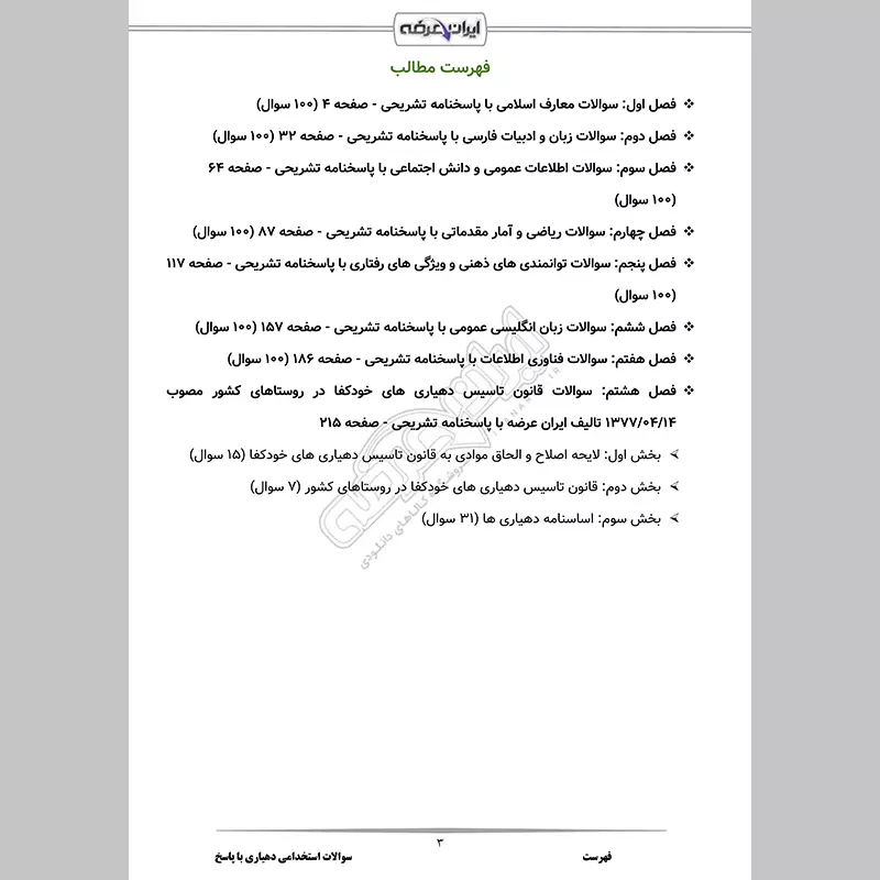 گروه آموزشی ایران عرضه اقدام به ارائه سوالات آزمون استخدامی دهیاری های کشور نموده است. این بسته شامل سوالات عمومی با پاسخنامه تشریحی و قابلیت پرینت برای آزمون استخدامی دهیاری های کشور میباشد. کارشناسان ما بر این باورند که این مجموعه عاملی مهم برای آمادگی شما در این آزمون بوده و قدمی مهم برای موفقیت در آن خواهد بود.