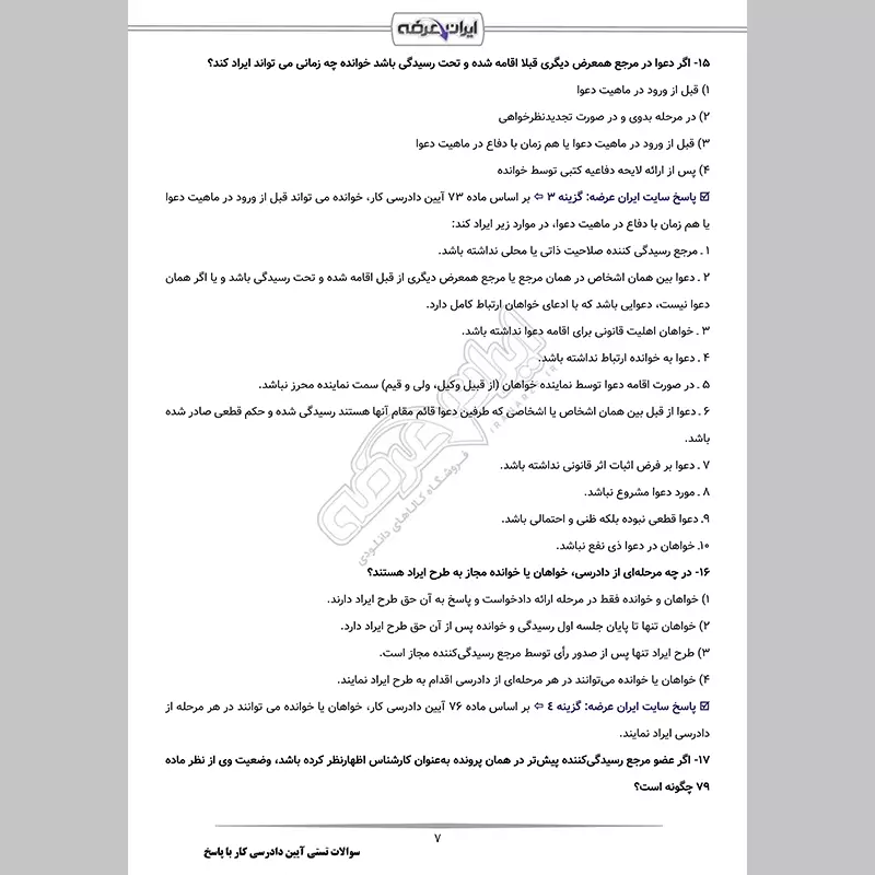گروه آموزشی ایران عرضه اقدام به ارائه بسته ای جدید برای سوالات تستی آیین دادرسی کار نموده است. این مجموعه شامل سوالات تالیفی ایران عرضه به همراه پاسخنامه تشریحی میباشد. کارشناسان ما بر این باورند که این مجموعه عاملی مهم برای آمادگی شما در آزمون های مختلف بوده و قدمی مهم برای موفقیت در آن خواهد بود.