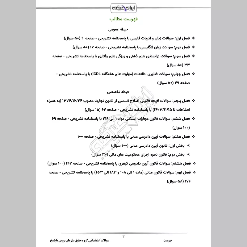 گروه آموزشی ایران عرضه اقدام به ارائه بسته ای جدید برای آمادگی در آزمون استخدام گروه حقوق سازمان بورس نموده است. این مجموعه شامل سوالات تالیفی استاندارد و طبقه بندی شده به همراه پاسخنامه تشریحی کامل می باشد. از سایر خصوصیات این بسته دارا بودن قابلیت پرینت در فایل جهت مطالعه آسان است. ما به کیفیت محصولات خود اطمینان داریم لذا کارشناسان ما بر این باورند که این مجموعه عاملی مهم برای آمادگی شما در این آزمون بوده و قدمی مهم برای موفقیت در آن خواهد بود.