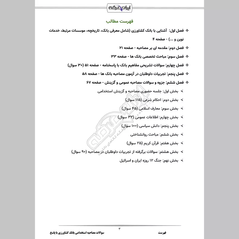 گروه آموزشی ایران عرضه اقدام به ارائه بسته ای جدید و بسیار کامل از سوالات پرتکرار به همراه درسنامه برای مصاحبه استخدامی بانک کشاورزی نموده است. این بسته شامل گلچینی از سوالات تخصصی در زمینه های مربوط به مسائل مختلف بانک ها و موسسات مالی و اعتباری و مسائل مهم عقیدتی و سیاسی به همراه پاسخنامه تشریحی می باشد. از مزیت های اصلی این بسته ارائه جزوه ویژه آشنایی با بانک کشاورزی می باشد. کارشناسان ما بر این باورند که این مجموعه عاملی مهم برای آمادگی شما در مرحله مصاحبه بوده و قدمی مهم برای موفقیت در آن خواهد بود.