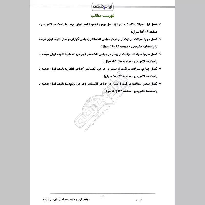 گروه آموزشی ایران عرضه اقدام به ارائه سوالات آزمون صلاحیت حرفه ای اتاق عمل (گروه پرستاری) نموده است. این بسته شامل سوالات استاندارد و طبقه بندی شده به همراه پاسخنامه تشریحی و قابلیت پرینت میباشد. کارشناسان ما بر این باورند که این مجموعه عاملی مهم برای آمادگی شما بوده و قدمی مهم برای موفقیت در آن خواهد بود.
