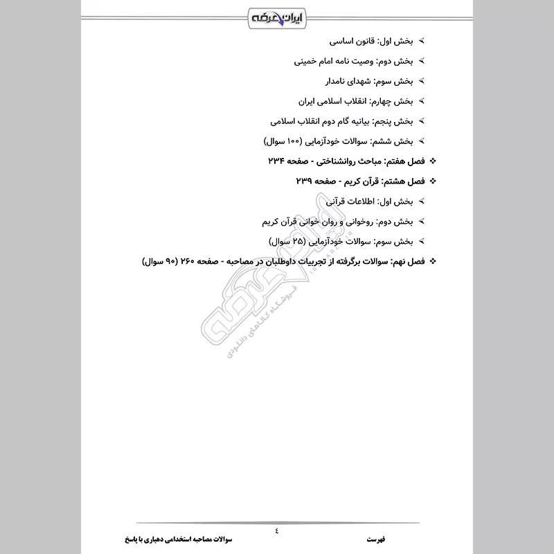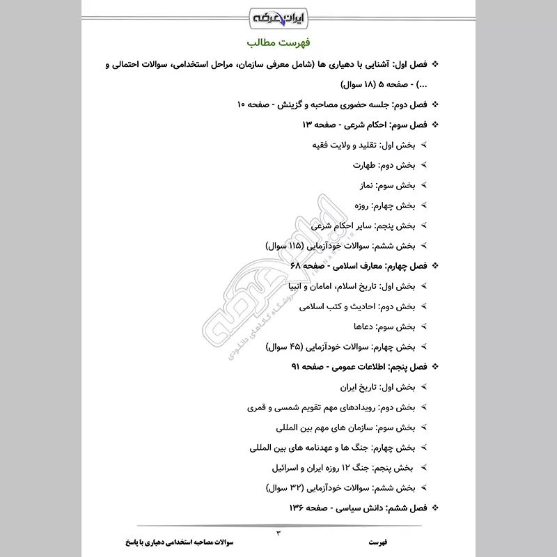 • فصل 1: آشنایی با دهیاری ها (شامل معرفی سازمان، مراحل استخدامی، سوالات احتمالی و ...) - صفحه 5 (18سوال)