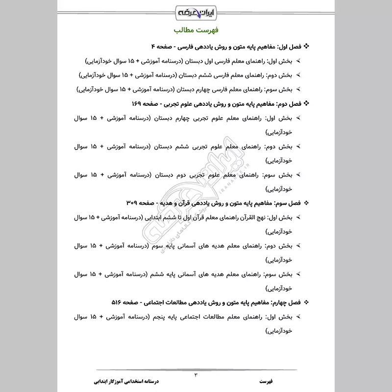 گروه آموزشی ایران عرضه اقدام به ارائه بسته ای جدید برای آمادگی در آزمون استخدامی آموزگار ابتدایی آموزش و پرورش نموده است. این محصول شامل جزوه آموزشی، نکات مهم و سوالات خودآزمایی حیطه ی تخصصی آموزگار ابتدایی است که در دو نسخه pdf و چاپی قابل دریافت است. مطالب موجود در این بسته طبق منابع آخرین آزمون برگزار شده است. در حال حاضر این بسته شامل دروس مفاهیم پایه متون و روش یاددهی قرآن و هدیه، مفاهیم پایه متون و روش یاددهی ریاضی، مفاهیم پایه متون و روش یاددهی علوم تجربی، مفاهیم پایه متون و روش یاددهی فارسی و مفاهیم پایه متون و روش یاددهی مطالعات اجتماعی خواهند بود.