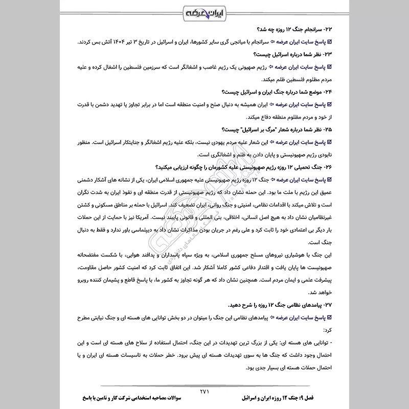 گروه آموزشی ایران عرضه اقدام به ارائه بسته ای جدید برای آزمون استخدامی شرکت کار و تامین نموده است. از مزیت های اصلی این بسته ارائه جزوه مصاحبه به همراه نمونه سوالات پرتکرار با پاسخنامه تشریحی درباره مسائل اخیر همچون جنگ 12 روزه و جنگ رمضان میباشد. از دیگر ویژگی های برجسته این بسته دانلود فوری فایل PDF و امکان چاپ محتوا جهت مطالعه آسان است و این مزیت مختص شما داوطلبان عزیز می باشد. این محصول برای مرحله مصاحبه کمک پرستاری (کمک بهیاری)، مصاحبه دارویار، مصاحبه نگهبان، مصاحبه دستیار دندان پزشک، مصاحبه منشی بخش و ... مفید و موثر می باشد. نکاتی که در بسته مصاحبه ازمون کار و تامین گنجانده شده است مفید و ارزشمند بوده و شما را قادر میسازد بتوانید تا جایی که میتوانید آمادگی بیشتری برای شرکت در مصاحبه و گزینش (عقیدتی و سیاسی) شرکت کار و تامین کسب نمایید.