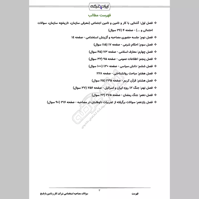 گروه آموزشی ایران عرضه اقدام به ارائه بسته ای جدید برای آزمون استخدامی شرکت کار و تامین نموده است. از مزیت های اصلی این بسته ارائه جزوه مصاحبه به همراه نمونه سوالات پرتکرار با پاسخنامه تشریحی درباره مسائل اخیر همچون جنگ 12 روزه میباشد. از دیگر ویژگی های برجسته این بسته دانلود فوری فایل PDF و امکان چاپ محتوا جهت مطالعه آسان است و این مزیت مختص شما داوطلبان عزیز می باشد. نکاتی که در بسته مصاحبه ازمون کار و تامین گنجانده شده است مفید و ارزشمند بوده و شما را قادر میسازد بتوانید تا جایی که میتوانید آمادگی بیشتری برای شرکت در مصاحبه و گزینش (عقیدتی و سیاسی) شرکت کار و تامین کسب نمایید. ما به کیفیت مطالب خود اطمینان داریم لذا پیشنهاد می کنیم از این فرصت طلایی استفاده کنید و با خرید و مطالعه این پکیج معتبر، کیفیت مطالعه خود را در زمینه منابع مصاحبه استخدامی شرکت کار و تامین بالا برده و با خاطری آسوده در جلسه ارزیابی شرکت کنید.