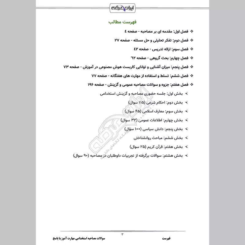 آزمون استخدامی دانشجوی مهارت آموز آموزش و پرورش در دو مرحله آزمون کتبی و مصاحبه حضوری برگزار میشوند. برای آمادگی شما عزیزان برای ارزیابی شایستگی معلمی و مصاحبه استخدامی دانشجوی مهارت آموز، این بسته که حاوی جزوه مصاحبه به همراه نمونه سوالات پرتکرار با پاسخنامه تشریحی میباشد، توسط گروه ایران عرضه تهیه و در اختیار شما کاربران عزیز قرار گرفته است. نکاتی که در این بسته گنجانده شده است مفید بوده و شما را قادر میسازد بتوانید تا جایی که میتوانید آمادگی بیشتری برای شرکت در ارزیابی تکمیلی (مصاحبه) و گزینش کسب کنید. شما همینک می توانید این محصول را از فروشگاه ایران عرضه خریداری و دانلود نمایید و با مطالعه آن هر چه بیشتر آماده آزمون شوید.